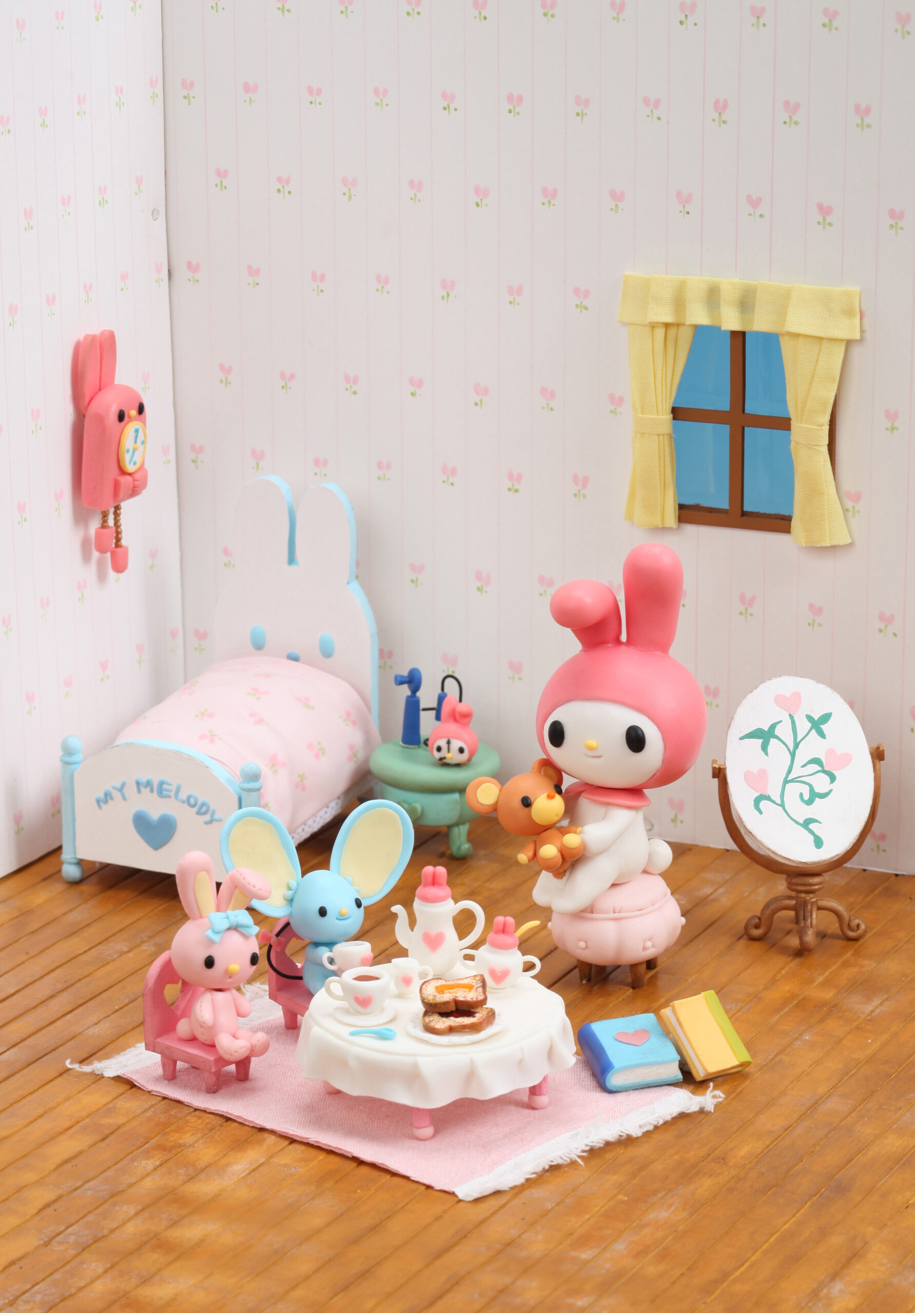 キャラクター、家具、食器、小物まですべて手作業による粘土細工。 マイメロディとフラットくんは樹脂粘土で造形し、丸みのあるフォルムや優しい表情を再現。家具やティーセットも粘土と発泡素材を組み合わせて制作しています。壁紙はすべて手描きによる花柄模様で彩り、レトロな雰囲気を演出。さらに、床は汚し加工を施したフローリングで、洋館のようなアンティーク感を表現しています。細部にまで温もりと懐かしさを感じられる“レトロなミニチュアハウス”として仕上げています。