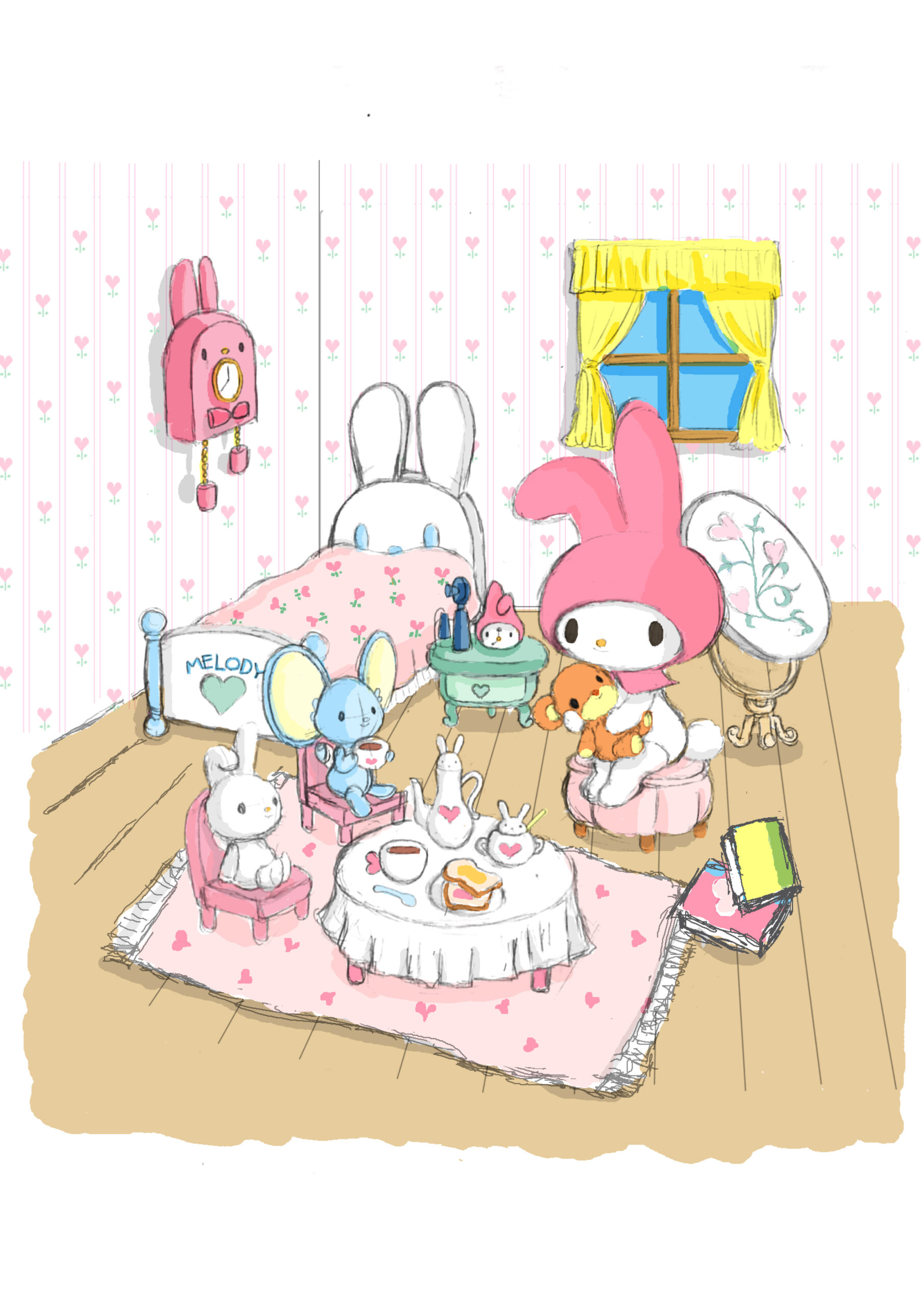 テーマは、マイメロディのお部屋で開かれるティータイム。仲良しのフラットくんを招き、お気に入りのカップやスイーツが並ぶお部屋で、やさしい時間を過ごしています。背景デザインには1970〜80年代のノスタルジーを取り入れ、“どこか懐かしくて温もりのある世界観”を目指しました。ドールハウスのような小さな空間で、おもちゃ遊びをする女の子の夢をそのまま形にした構成です。