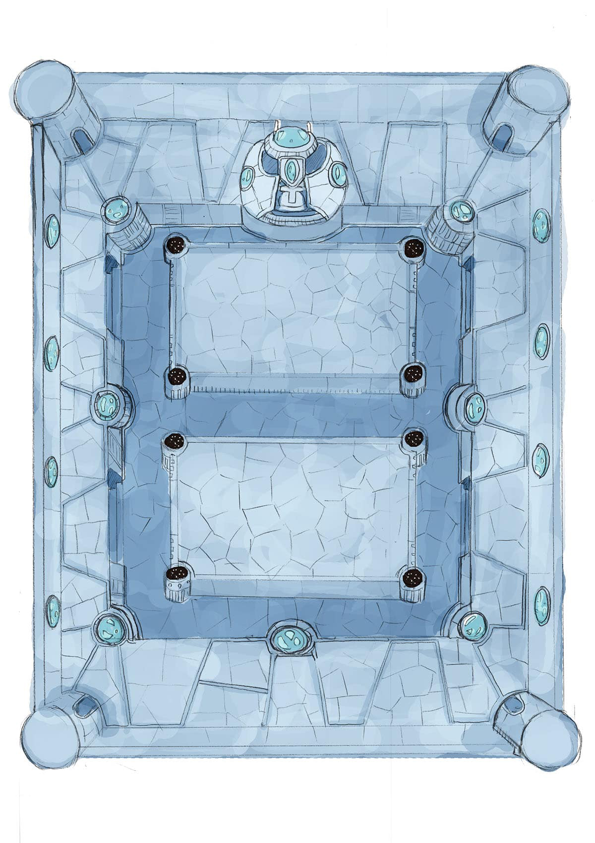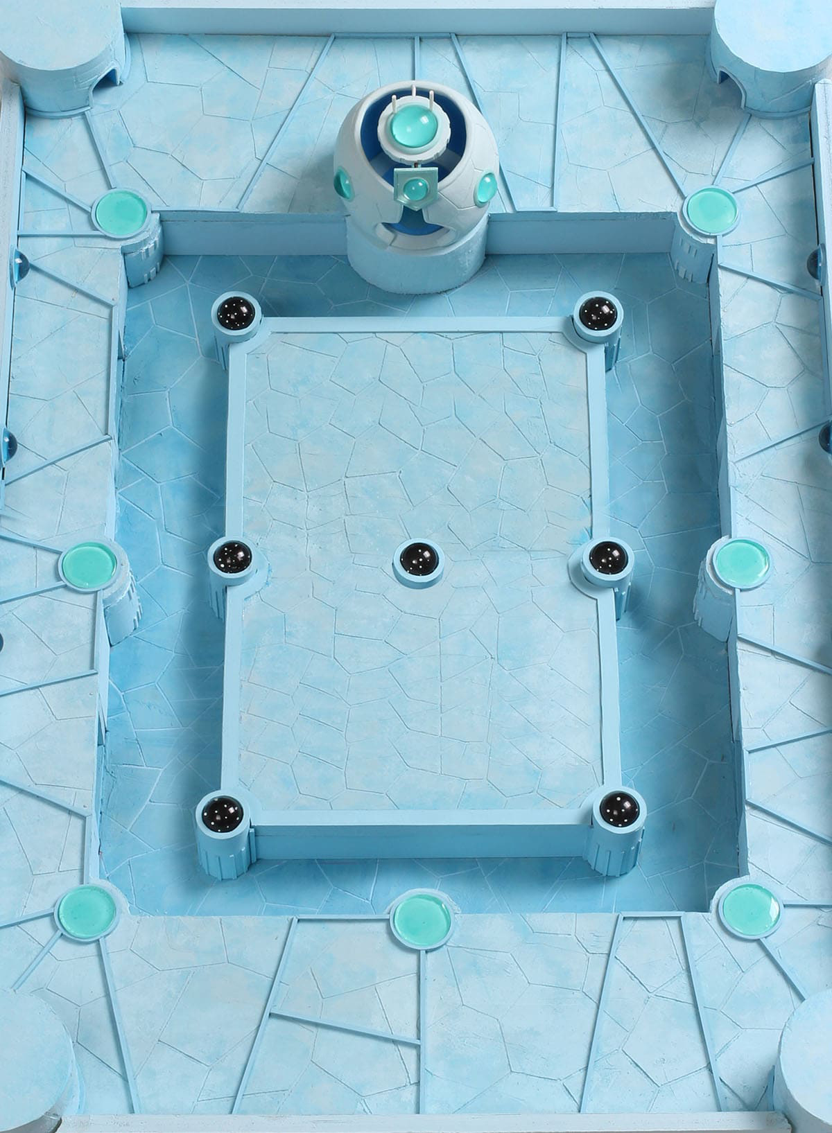 「生命増殖炉」は、神殿のような荘厳さと、人工物としての機能美が同居する“拠点”として設計しました。神秘性とテクノロジーの共存を表現するため、全体は青を基調とした冷たいトーンで統一。床面は直線的な構造を避け、自然の結晶体を思わせる不規則な多面体で構成することで、有機的で未知の技術感が立ち上がる造形にしています。