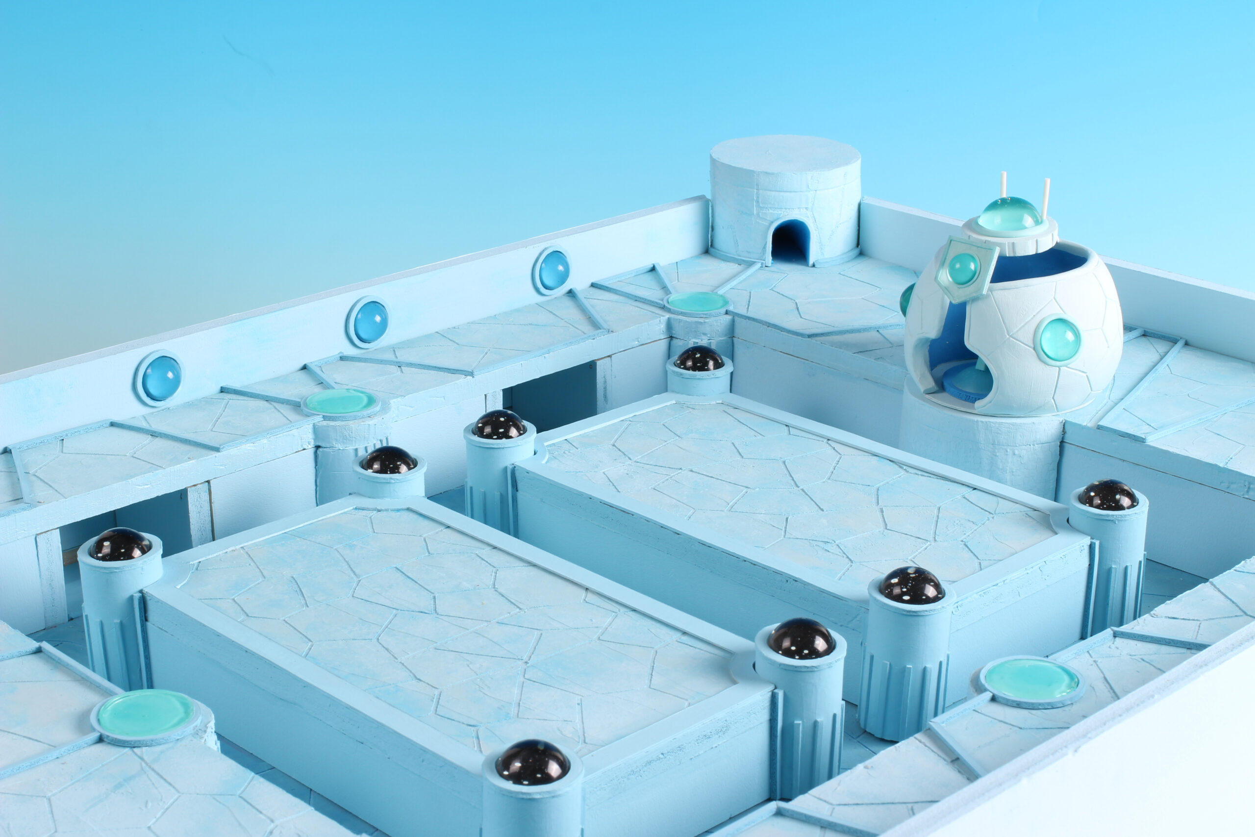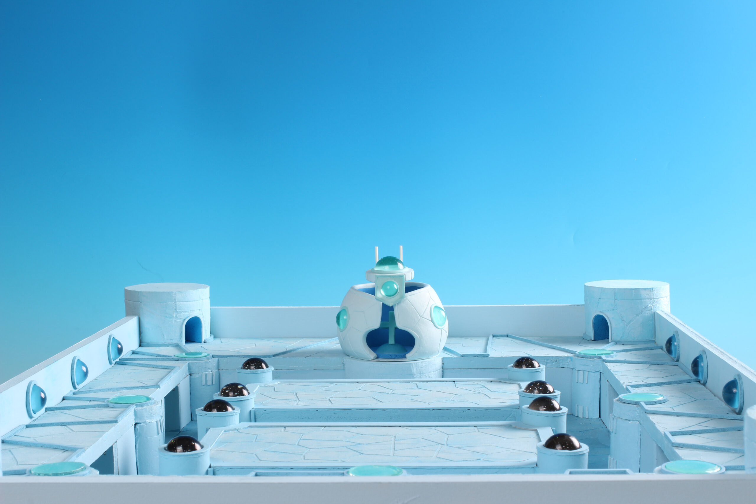本作は、幻想建築としての世界観設計と、実写取り込み素材としての撮影成立を両立させたジオラマ美術です。粘土造形と照明演出、レジンの光学的表現を統合し、アナログとデジタルを接続する背景制作として、粘土の新たな可能性を提示しました。