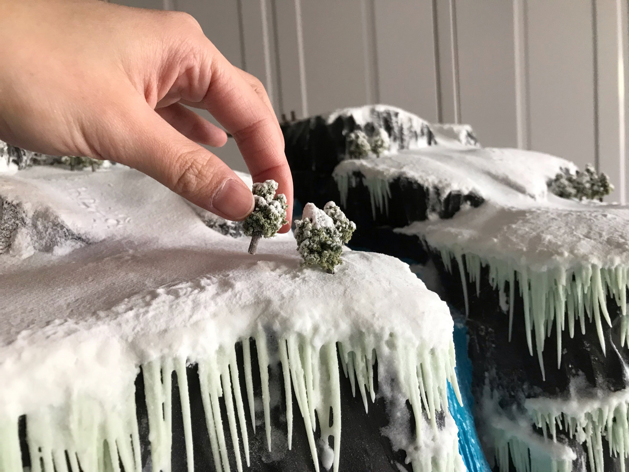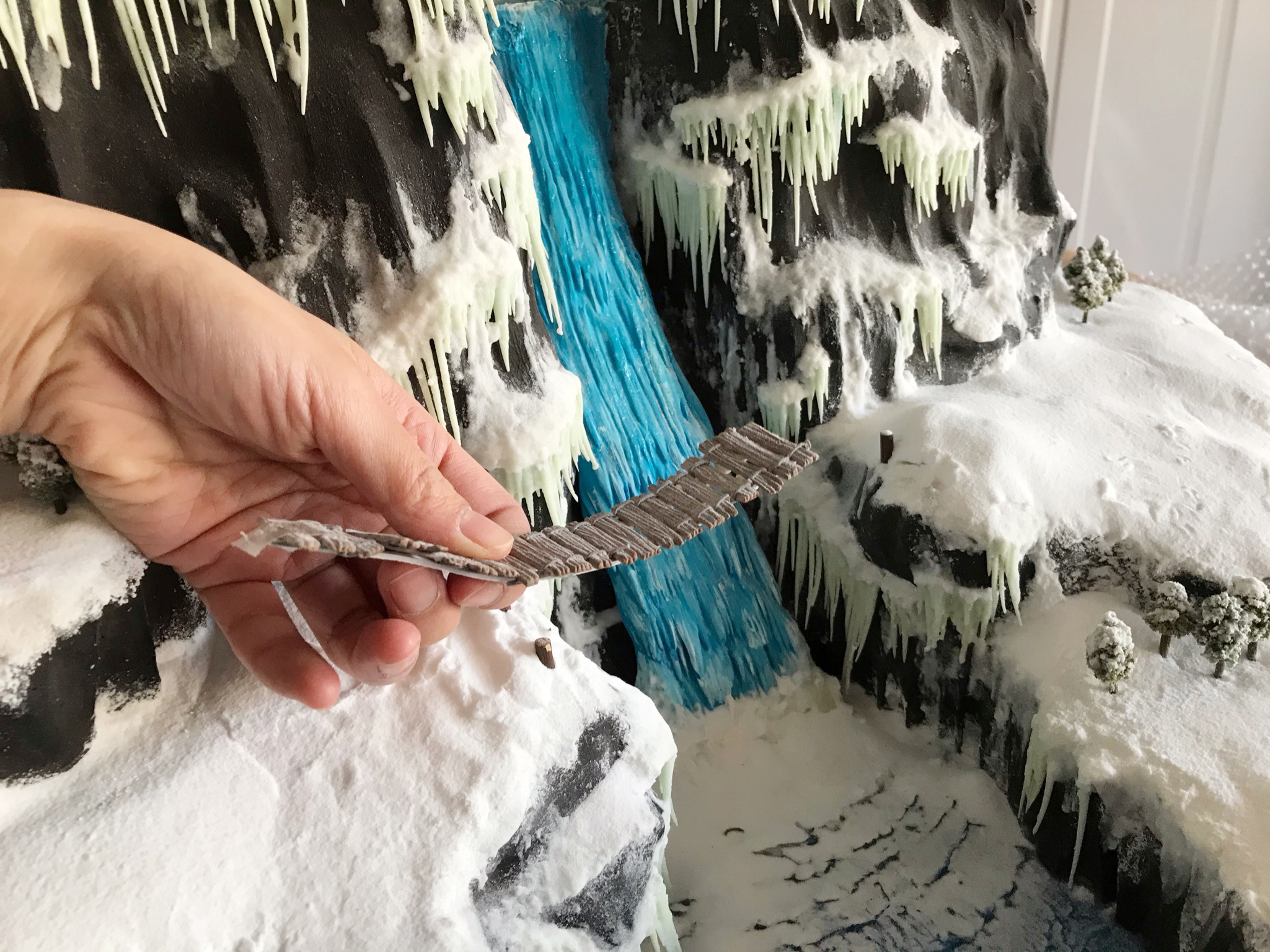 この作品では、細部の一つひとつに現実的な重量感と寒冷表現が施されています。岩肌にはアクリルガッシュを何層にも塗り重ね、地層のように積み上がる汚れや凍結の質感を構築。その複雑な汚しが“歴史ある断崖”としての深みを与えています。吊り橋は、キャラクターが通行する重要な構造物として、「崩壊寸前のリアリティ」を意識して設計。木材部分は粘土と実際の木片を併用し、一本ごとに削り・反らせ・欠けを加え、ロープは針金でテンションをかけながら吊り構造を再現。見た目の不安定さを演出することで、冷たくも緊張感のある世界観を強調しました。木々の造形にも徹底したこだわりを持ち、スポンジと木材で形成した枝葉に雪の重さや積雪時間を計算しながら雪を降り積もらせています。これにより、ただ白い雪ではなく、時間の経過を感じる雪景が生まれました。