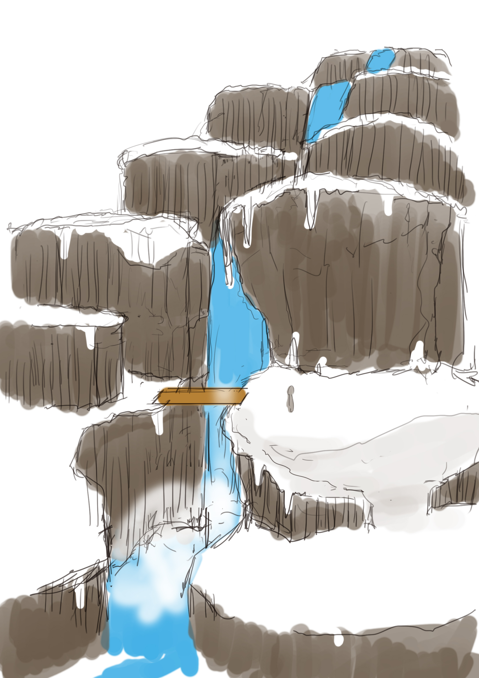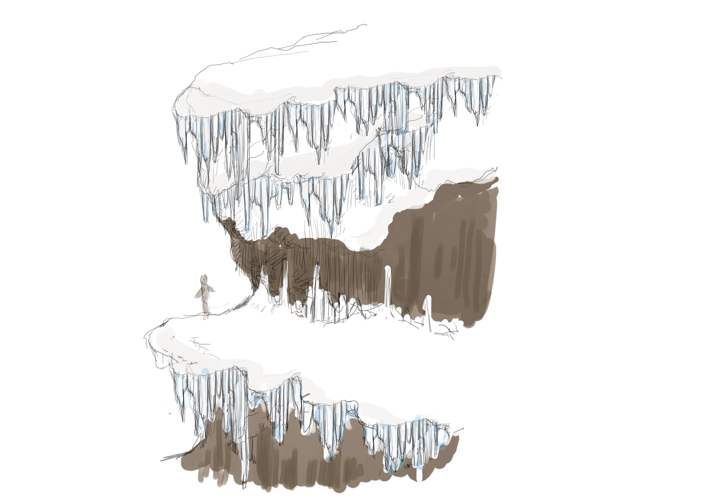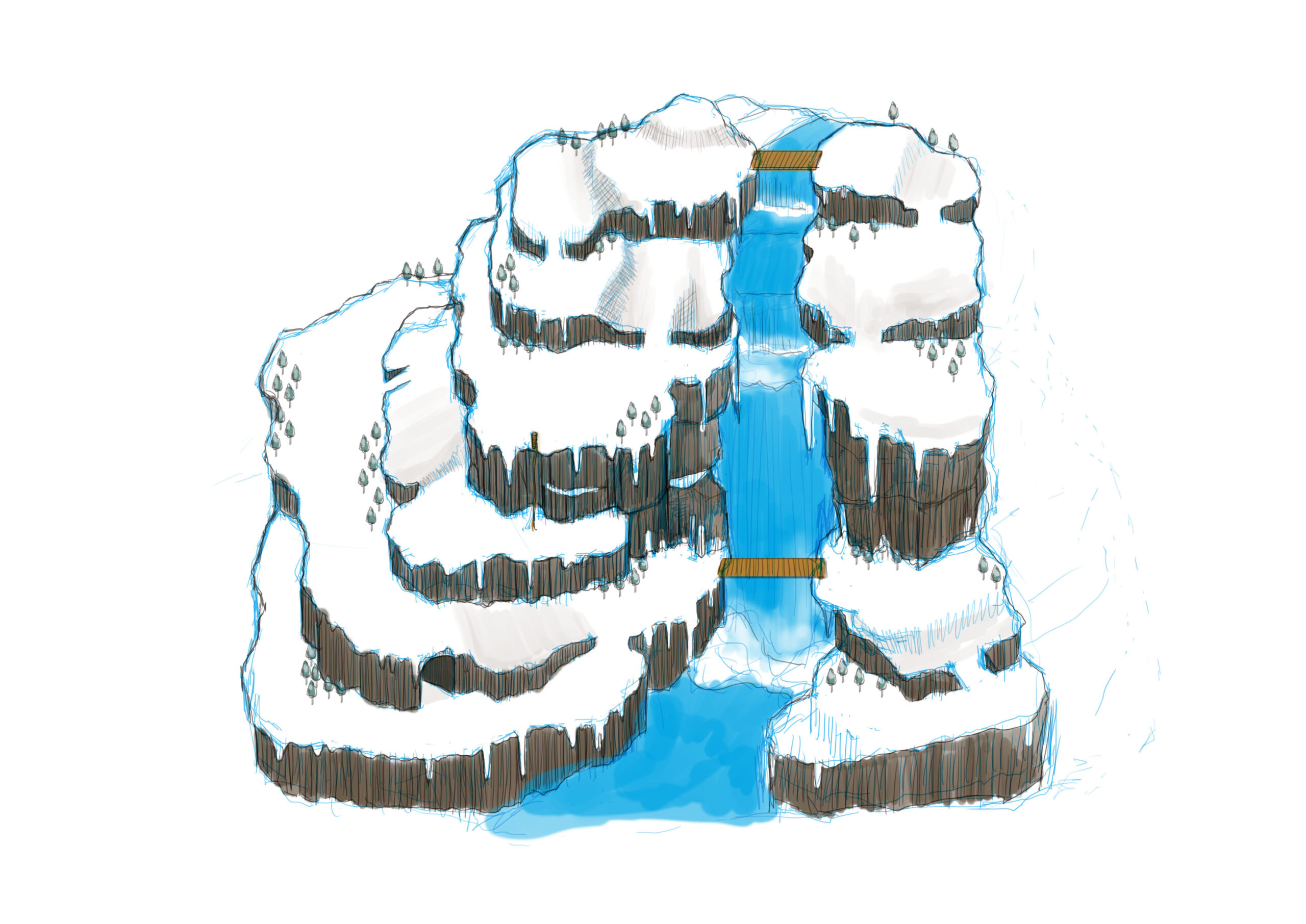 “ファルシオンの抜け道・断崖”は、極寒の山岳地帯にそびえる雪と氷の回廊です。氷柱が垂れ、吹雪が舞い、足を踏み外せば奈落に落ちるような危うさを孕みながら、プレイヤーを緊張と静寂の中へ導く舞台として設計されています。ジオラマでは、地形をスチロールで骨格構成し、複数種の粘土を重ねて雪山の重量感と彫刻的造形美を表現。 重曹を微粒化した独自のパウダースノー素材で雪の質感を再現し、 光の反射や陰影までコントロールした繊細な表面処理を施しています。崖から垂れる氷柱は透明粘土を一本ずつ手作業で造形し、長さ・角度・付着雪の状態をすべて異なるパターンで再現。自然がつくり出すランダム性を、職人の手によってコントロールした“人工の自然”として成立させました。滝の流れも一体成形で制作し、表面には細かな凹凸を刻むことで、水が流れ落ちる瞬間の速度感と冷気を感じさせる造形に。水面にはジェルメディウムを用い、波紋がわずかに広がった直後に凍りつくような“時間が止まる瞬間”を立体的に捉えています。 波紋の上にシャーベット状の雪を薄く重ねることで、氷点下の水面に広がる冷たさと静寂を表現しました。