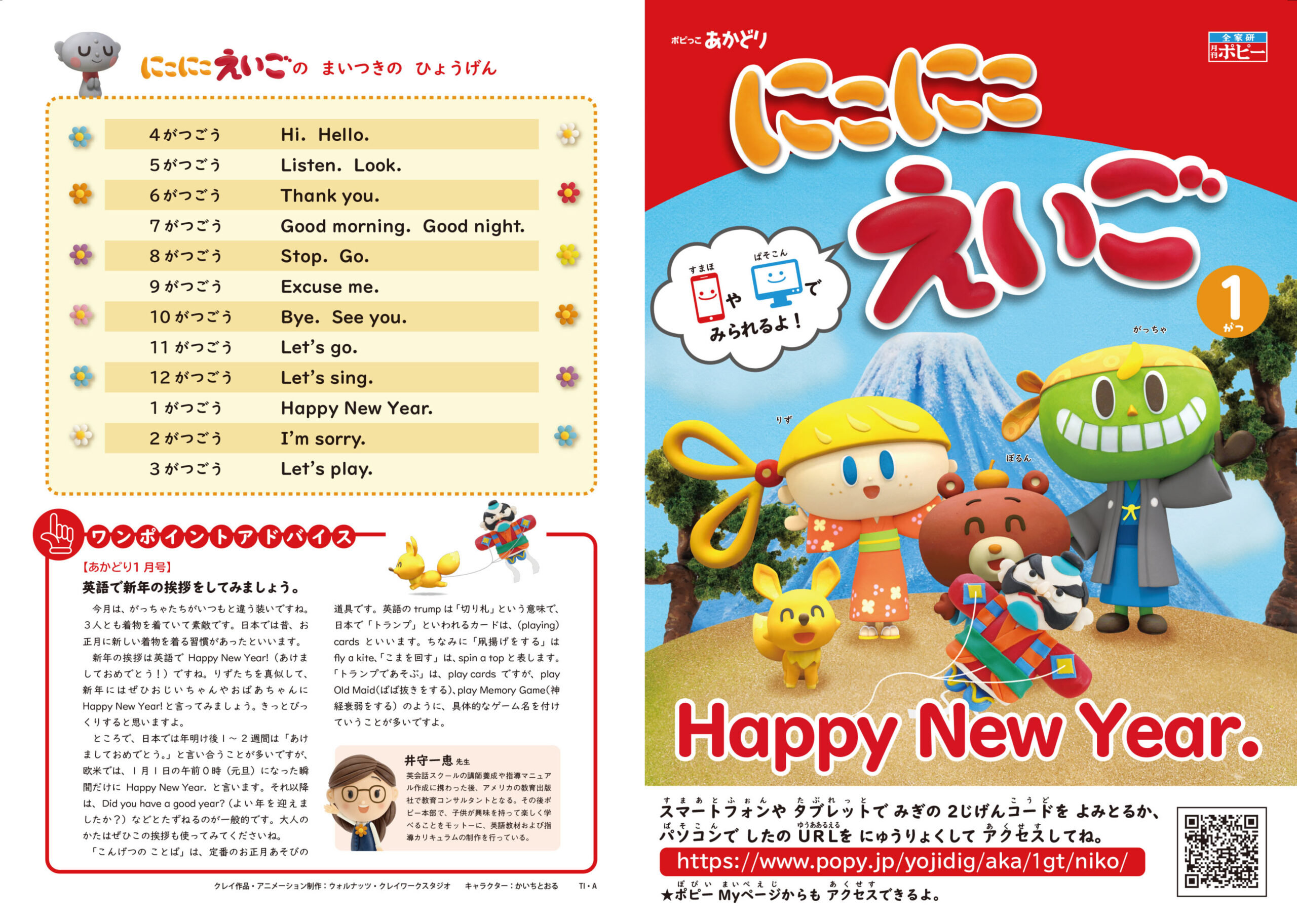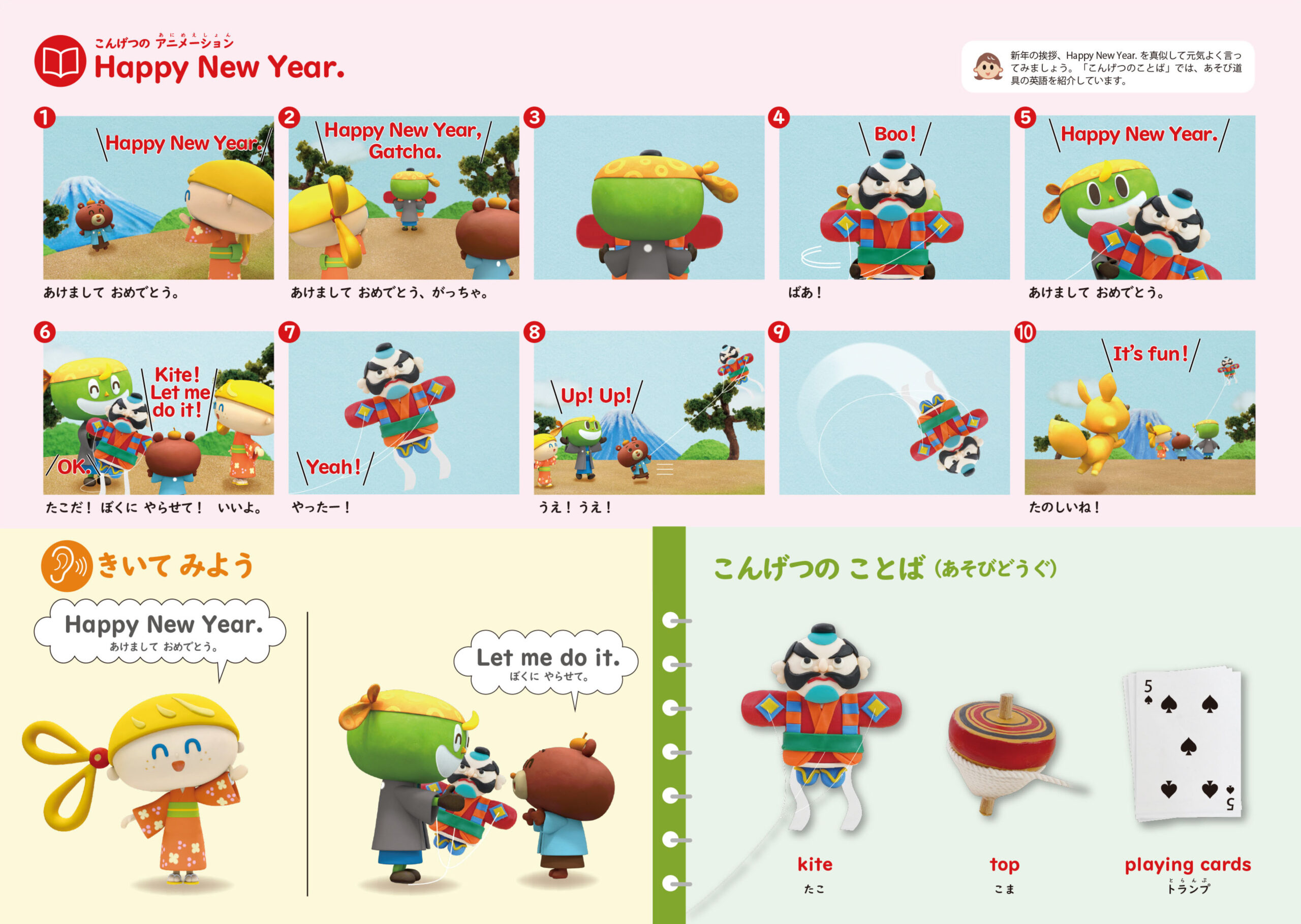 今月は、ガッチャたちがいつもと違う装いです。3人とも着物を着ていて、とても素敵。日本では昔、お正月に新しい着物を着る習慣がありました。新年の挨拶は英語で “Happy New Year!”(あけましておめでとう!)。リズたちをまねして、おじいちゃんやおばあちゃんに「Happy New Year!」と言ってみましょう。きっと笑顔で驚いてくれるはずです。また、日本では年明け後1〜2週間「明けましておめでとう」と言い合うことが多いですが、欧米では1月1日の午前0時(元旦)になった瞬間にだけ「Happy New Year!」と言い、それ以降は “Did you have a good year?”(よい年を迎えましたか?)などとたずねるのが一般的です。そんな文化の違いも、アニメを通じて自然に感じられる構成になっています。さらに「今月のことば」では、お正月あそびの道具を英語で紹介。“trump”は「切り札」、日本でいう「トランプ」は “(playing) cards”。