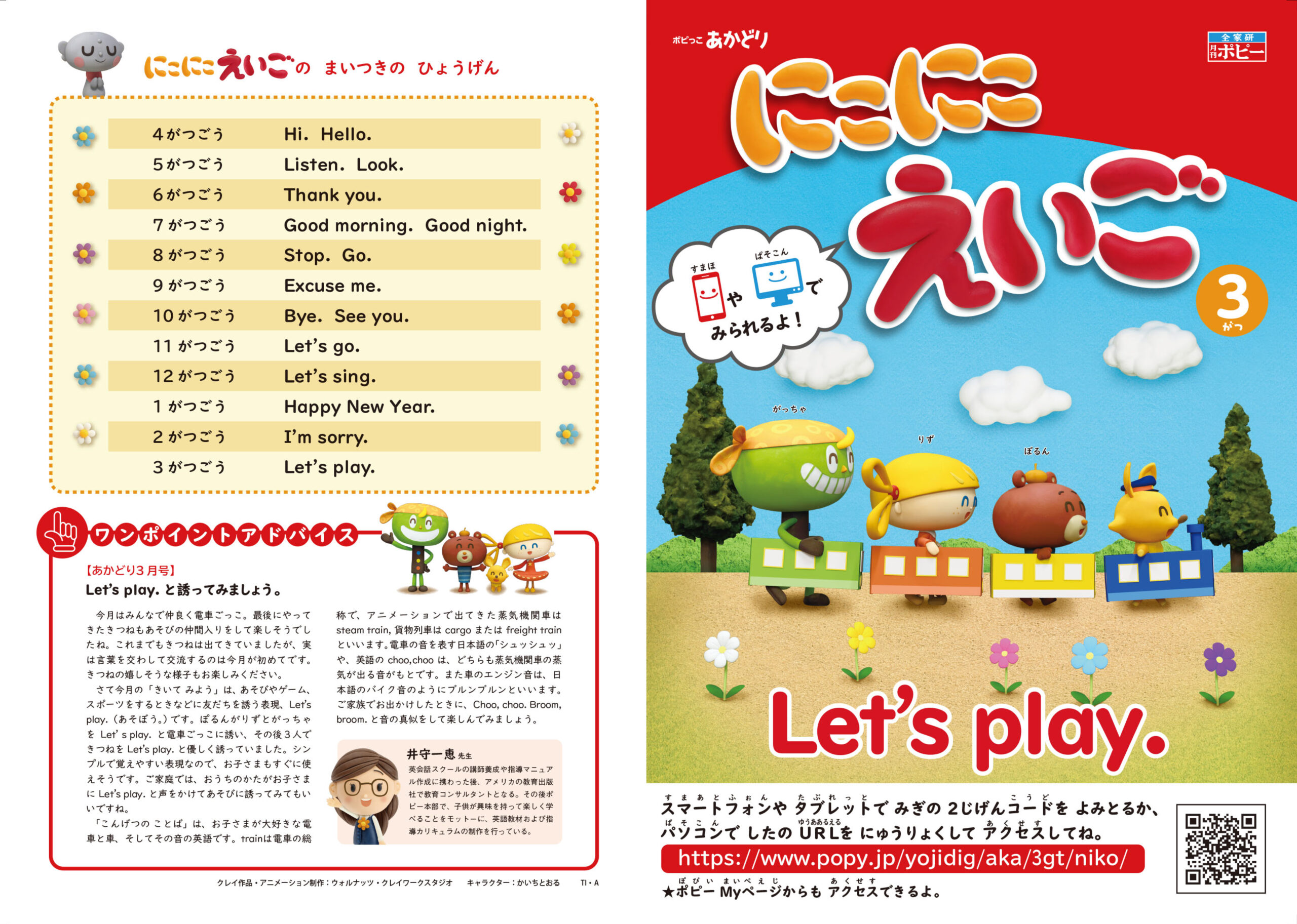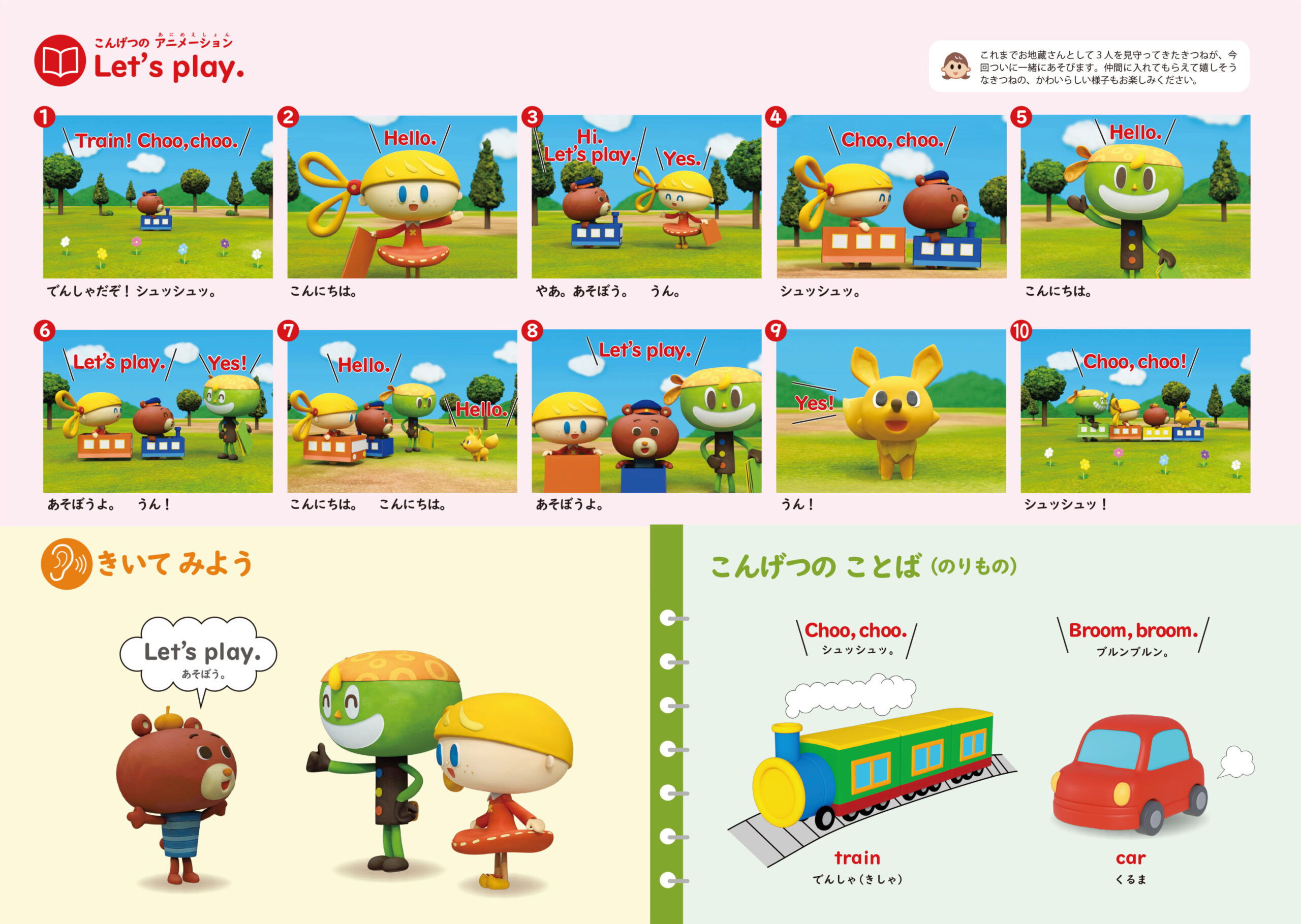 幼児英語教材『幼児ポピー にこにこえいご』(株式会社新学社)にて、ストップモーション技法によるクレイアニメーション(粘土アニメーション)作品を制作しました。 テーマは “Let’s play.(あそぼう)”。仲良く電車ごっこをしているリズ・ガッチャ・ポルンが、話しかけられずにいたきつねさんに「Let’s play.(いっしょにあそぼう)」と声をかける――。“おともだちになることは簡単だよ、一緒にあそぼうと伝えてみよう”というメッセージを込めた、春にぴったりの温かいクレイアニメーションです。