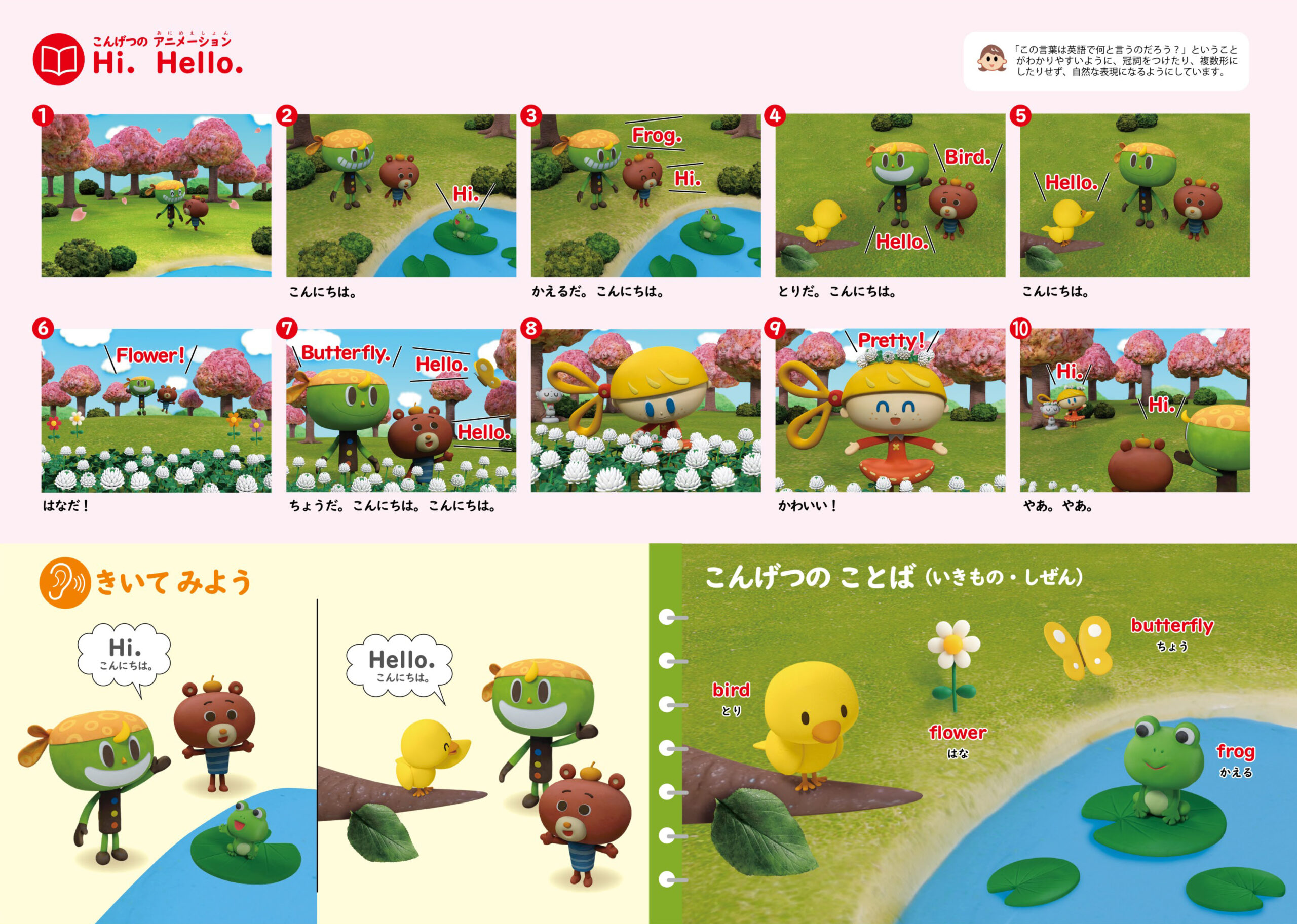 テーマ:「Hi./Hello.」であいさつしてみよう! 朝の公園で遊ぶガッチャとポルン。そこにリズやお地蔵さん(キツネさん)、カエルや小鳥たちもやってきて、“Hi!” “Hello!” と元気に声をかけ合います。あいさつがつながるたびに場面が明るくなり、笑顔がひろがっていく――。“言葉で気持ちを伝える”第一歩として、英語でのあいさつを楽しく学べるストーリーです。「きいてみよう」では、“Hi.”と“Hello.”の使い方を紹介。どんな時間帯や相手にも使える便利な表現として、何度も繰り返し登場します。また「こんげつのことば」では、子どもに身近な“animals(生き物)”や“nature(自然)”の単語を紹介。“bird(とり)”“flower(はな)”“frog(かえる)”など、親しみやすい単語を聞いて、キャラクターのまねをしながら発音練習できるよう構成されています。