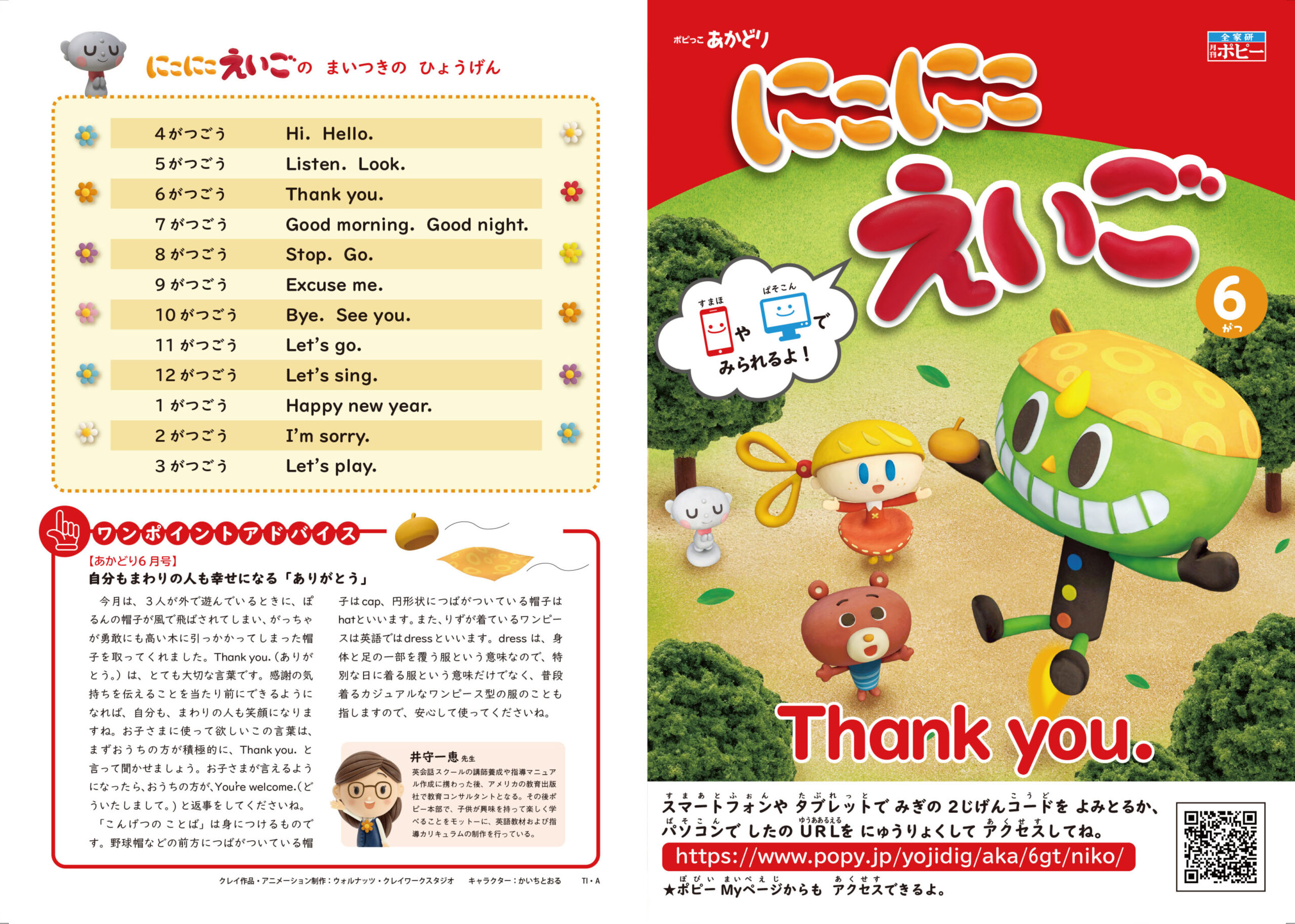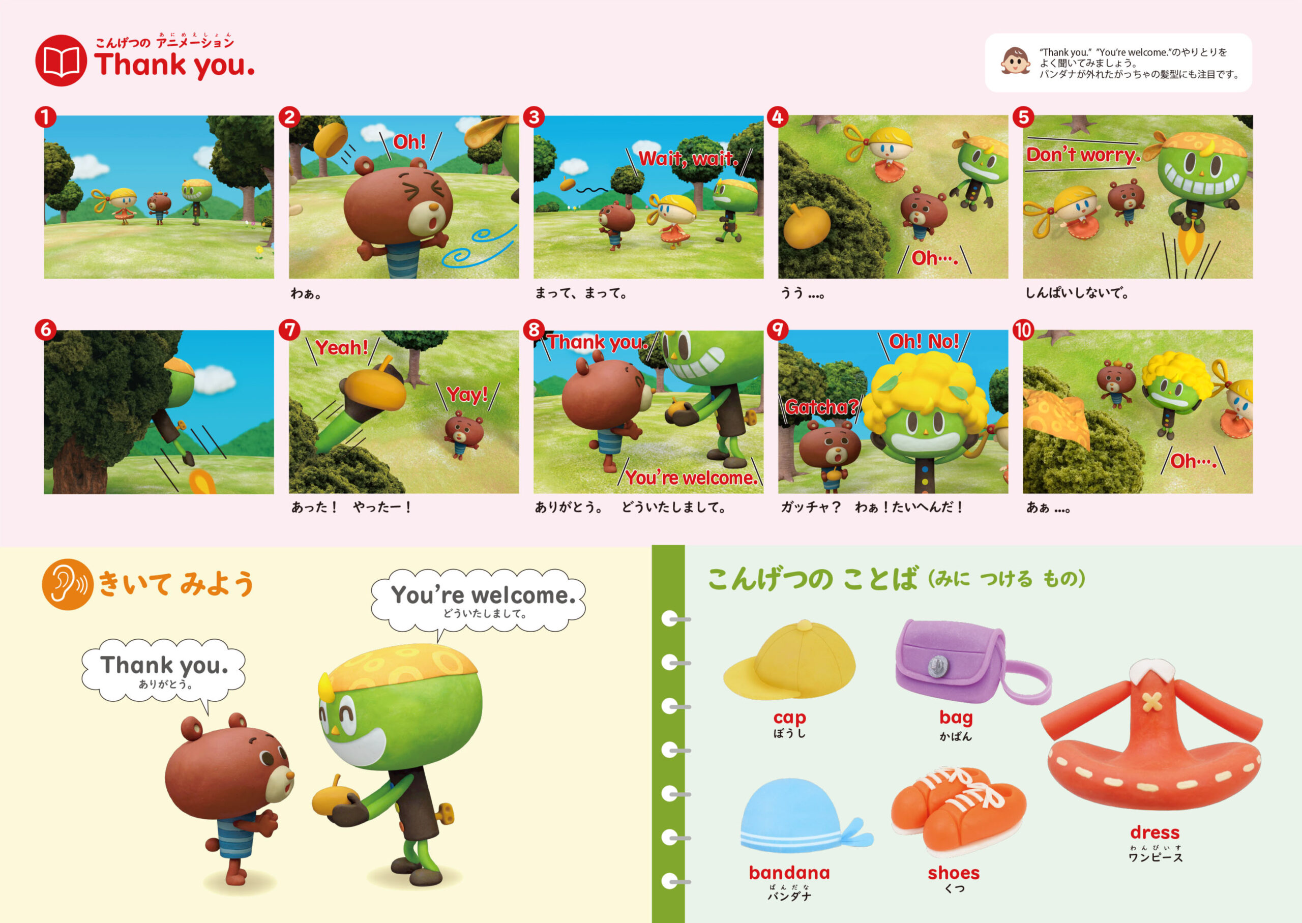 幼児英語教材『幼児ポピー にこにこえいご』(株式会社新学社)にて、ストップモーション技法によるクレイアニメーション(粘土アニメーション)作品を制作しました。テーマは “Thank you.” “Here you are.” “You’re welcome.”(ありがとう・どうぞ・どういたしまして)。感謝とやりとりの英語表現を、コメディタッチで描いた心あたたまるクレイアニメーションです。