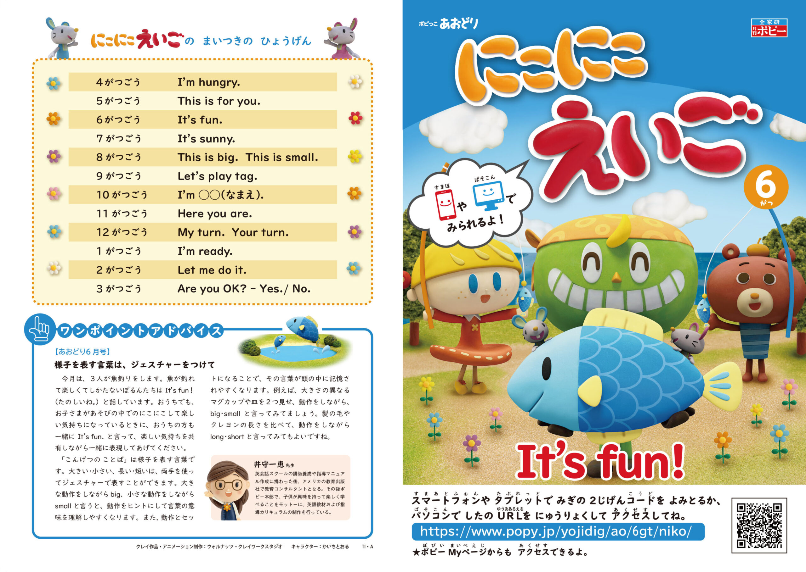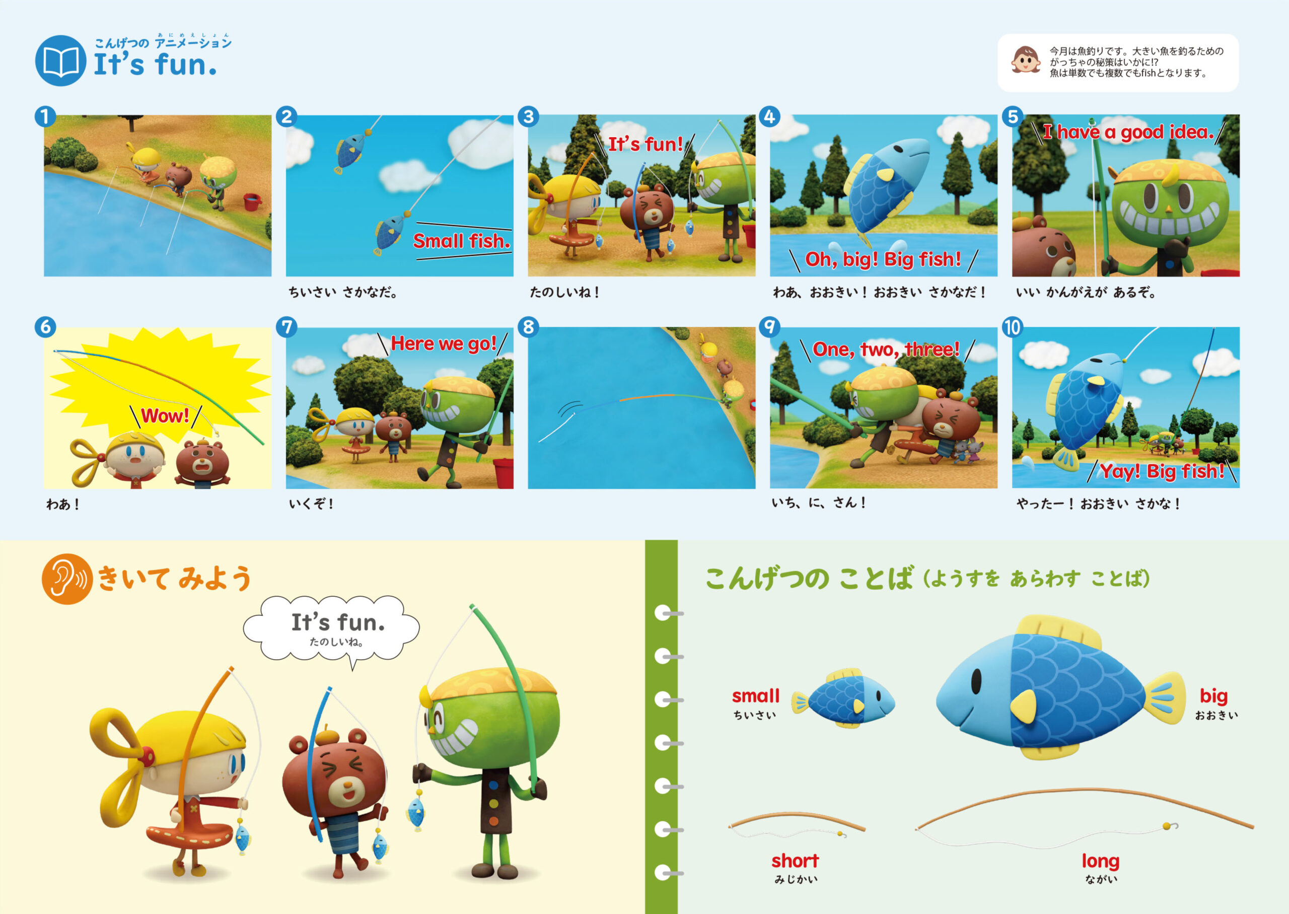 幼児英語教材『幼児ポピー にこにこえいご』(株式会社新学社)にて、ストップモーション技法によるクレイアニメーション作品を制作しました。 テーマは “It’s fun!”(たのしいね)。湖で釣りを楽しむ3人が、“It’s fun!” と喜びながら遊ぶ中、がっちゃの釣竿にかかった“大物”をみんなで協力して引き上げようとする―― 楽しさとチームワークを描いた、ユーモアと温かさあふれる英語クレイアニメーションです。
