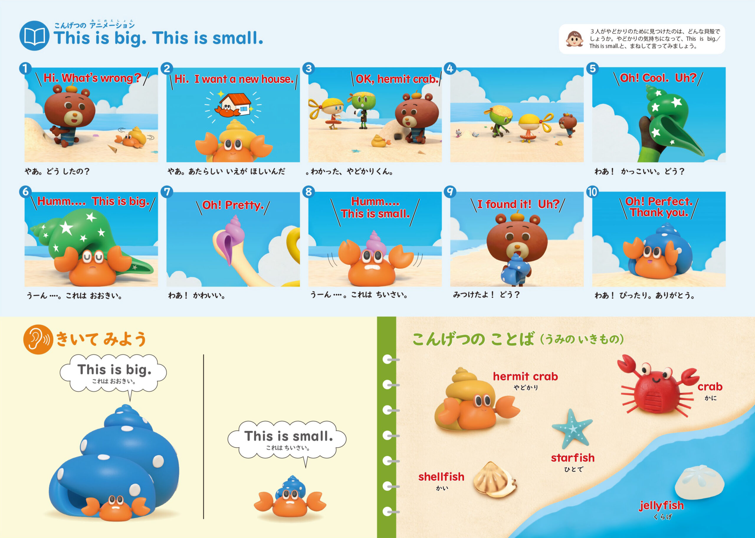 家庭では、おもちゃや身の回りの物を使いながら、両手を広げて “This is big.”、指を寄せて “This is small.” と動作をつけて表現してみましょう。また、親子で手や足を合わせて「どっちが大きいかな?」と比べながら言うと、自然に楽しく学べます。さらに「こんげつのことば」は海の生き物。浜辺に落ちている貝殻は “shell”、生きている貝は “shellfish”。実際に海や水族館で見つけた生き物の名前や大きさを英語で話すことで、アニメーションと実体験がつながり、ことばの定着につながります。