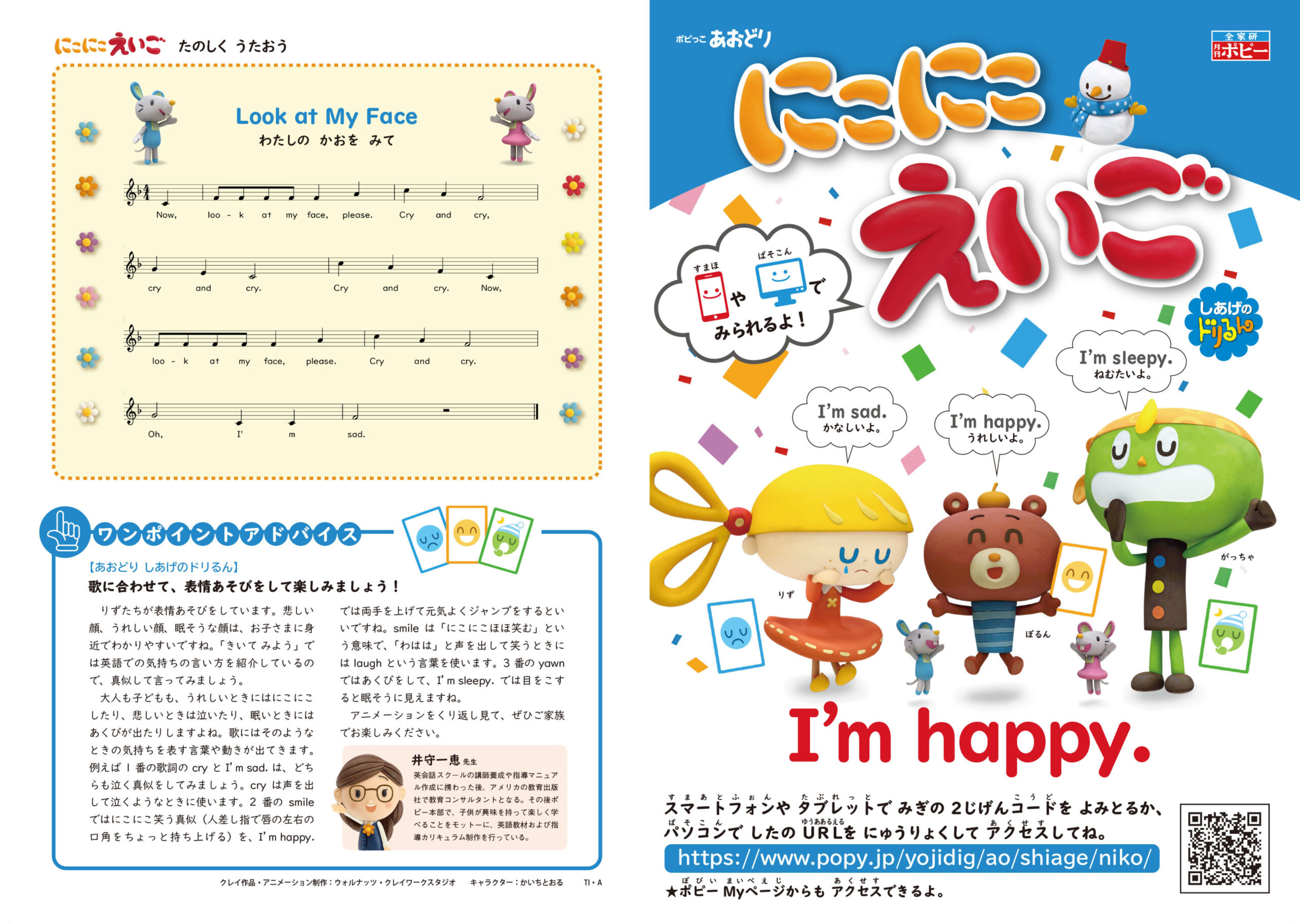 幼児英語教材『幼児ポピー にこにこえいご』(株式会社新学社)特別号「しあげのドリるん」にて、ストップモーション技法によるクレイアニメーション作品を制作しました。テーマは “I’m sad.” “I’m happy.” “I’m sleepy.” “Cry.” “Smile.” “Yawn.”。リズ・ガッチャ・ポルンが部屋の中でねずみさんたちと出会い、カードに描かれた表情の真似をしながら英語で感情を表現する、リトミック型の英語あそびアニメーションです。