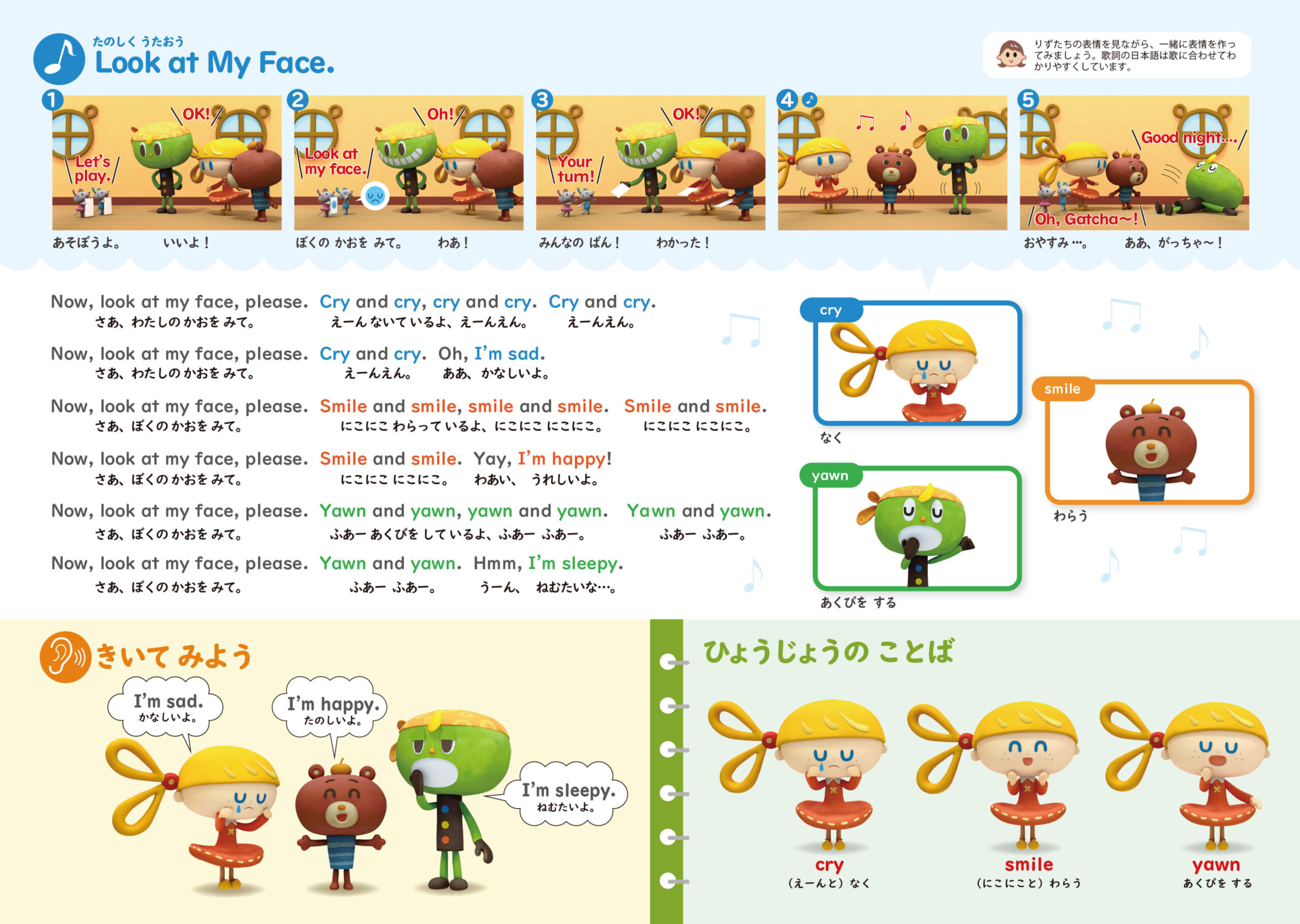 テーマ:“I’m sad.” “I’m happy.” “I’m sleepy.” “Cry.” “Smile.” “Yawn.”