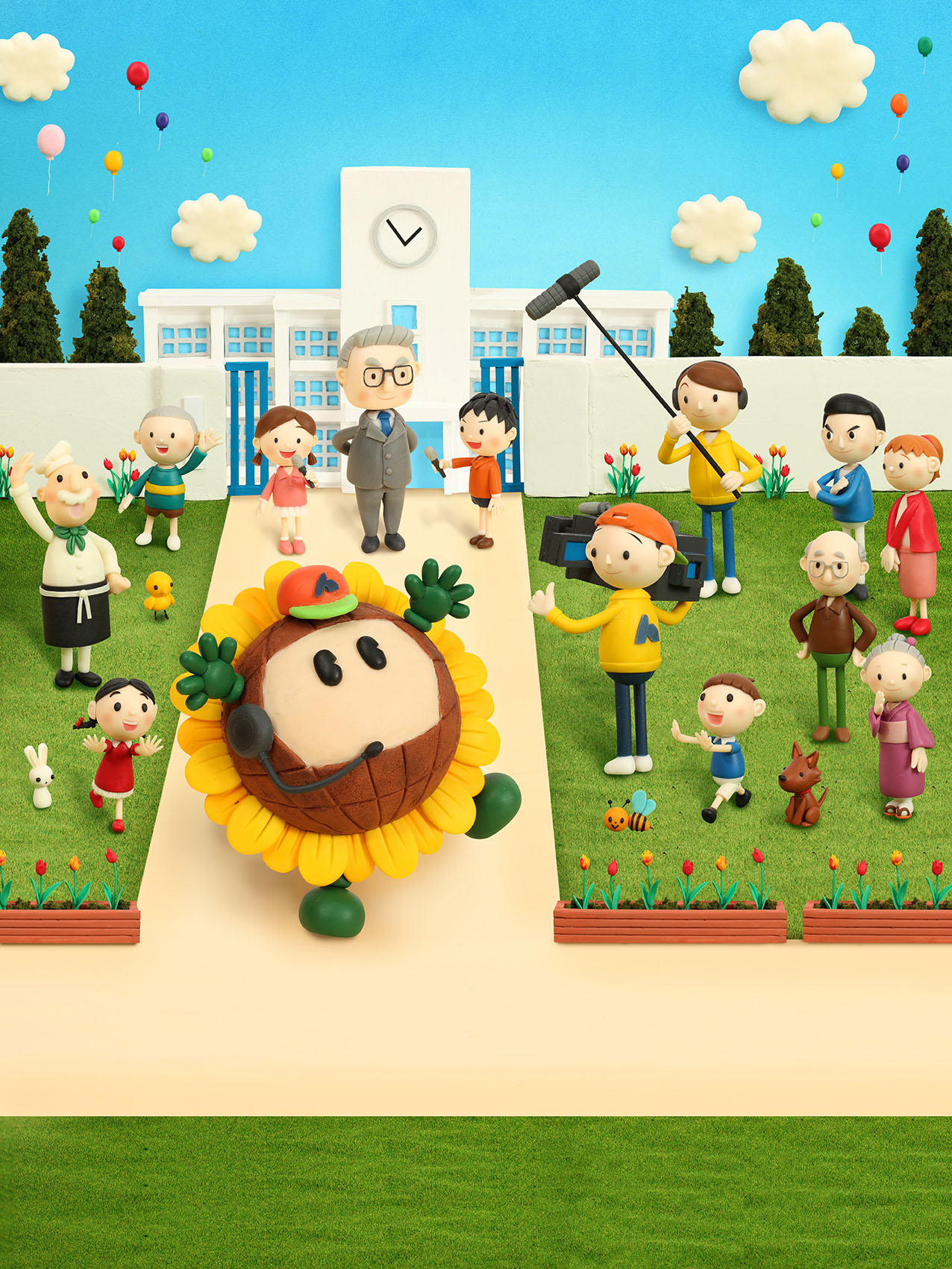 ひまわりネットワークさまの新聞広告・2月号ビジュアルとして制作されたクレイアート作品。地域に密着したテレビ番組放送を行う企業として、「地域の魅力を自分たちの手で伝える」をテーマにデザインされています。作品では、小学生がインタビュアーとなり、学校の魅力を校長先生に語ってもらう撮影シーンを、イメージキャラクター“ひまわりくん”とスタッフたちが見守る様子で表現。ひまわりネットワークが自社制作番組を通して地域情報を発信していることを、温かく楽しい世界観で伝えるビジュアル構成になっています。ウォルナッツ・クレイワークスタジオがビジュアルデザイン(イメージラフ・レイアウト)から立体造形、照明、撮影、編集までを一貫して担当しました。