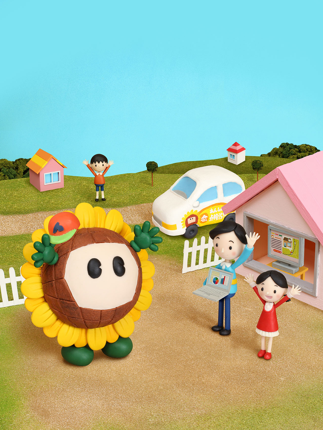 キャラクターと住宅のミニチュアセットは、すべて手作業によるクレイアート造形。樹脂粘土と軽量粘土を併用し、人物・家・家具・パソコン・配線など、生活感のある小道具を細部まで丁寧に制作しています。地面はジオラマ用粉末素材を使用し、自然な質感と立体感を再現。明るい配色と丸みのある造形で、“地域密着の安心感”と“人の温かさ”を感じさせるビジュアルに仕上げました。
