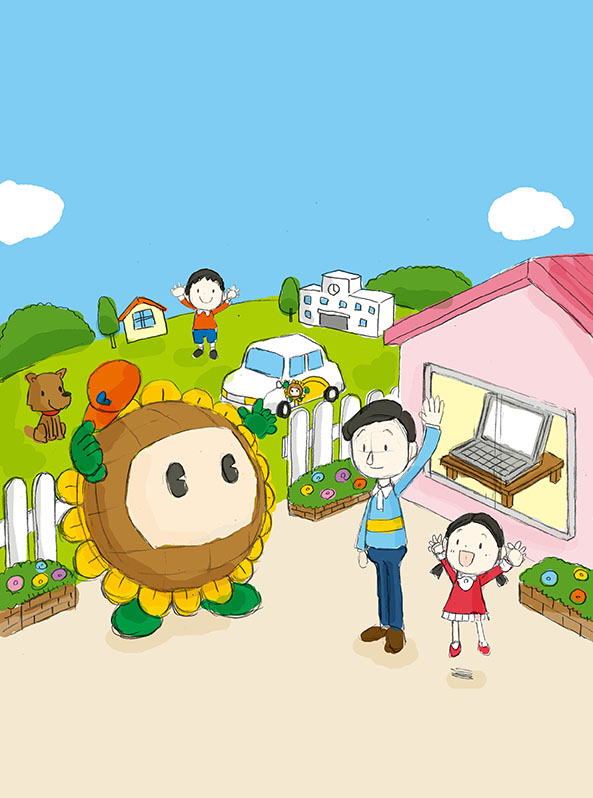 ひまわりネットワークさまの新聞広告ビジュアルとして制作されたクレイアート作品。テーマは「ひまわりネットワークのかけつけサポート」。パソコンのトラブルが起きた家庭に、イメージキャラクター“ひまわりくん”が駆けつけ、無事に問題を解決して「ありがとう、ひまわりくん」と父子が感謝を伝える様子を描いています。ウォルナッツ・クレイワークスタジオが、ビジュアルデザイン(イメージラフ・レイアウト設計)から立体造形、照明、撮影、編集までを一貫して担当しました。家庭的で親しみやすい世界観を、クレイアートの柔らかい質感と構図で表現しています。