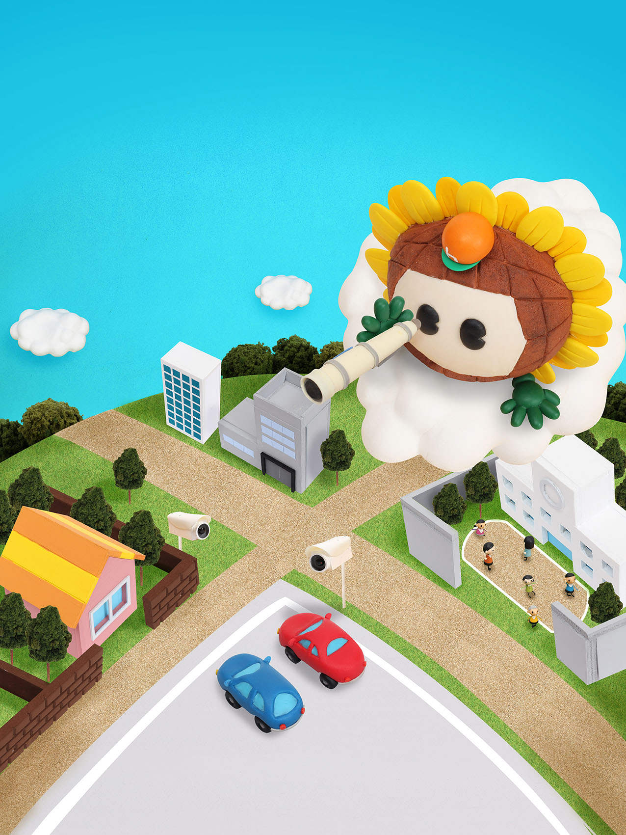 ひまわりネットワークさまの新聞広告・5月号ビジュアルとして制作されたクレイアート作品。テーマは「防犯カメラと地域の安全」。 ひまわりくんが雲に乗り、空から街を見守る様子を立体的に表現しています。地域の安心を象徴する“防犯カメラ”をモチーフに、街の安全を支える温かい視点をデザインに込めました。ウォルナッツ・クレイワークスタジオが、ビジュアルデザイン(イメージラフ・レイアウト構成)から立体造形・照明・撮影・編集までを一貫して担当しています。