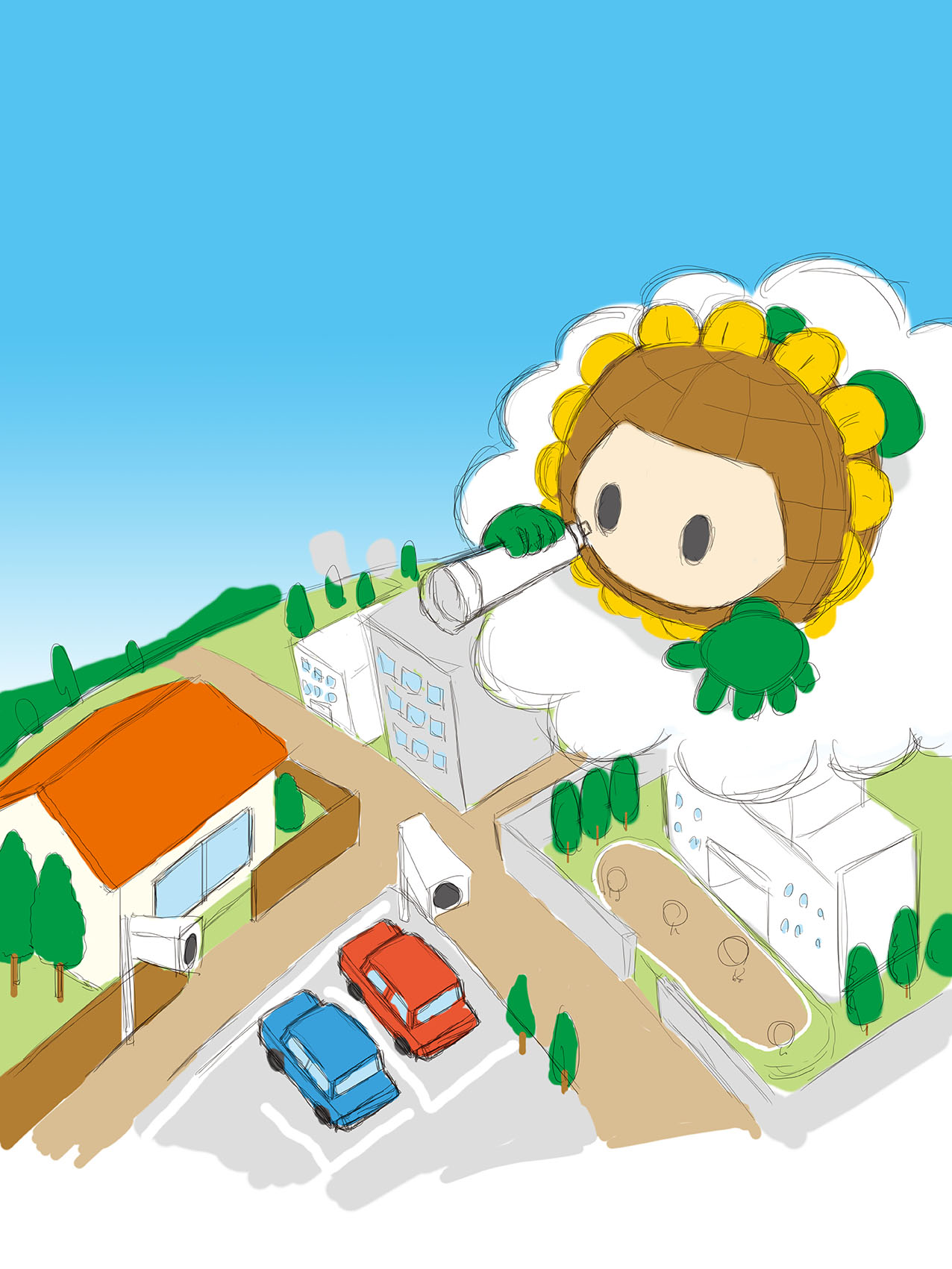 キャラクターのひまわりくんや望遠鏡・車・防犯カメラなどの小物はすべて樹脂粘土による手作り造形。街並み(ビル・家)はスチロール素材をベースに制作し、建物の質感や彩色を丁寧に仕上げています。 オブジェクトごとに素材を使い分けることで、軽やかで奥行きのある世界観を表現しました。全体の配色は青空と街のコントラストを活かし、安心感と明るさを両立させています。