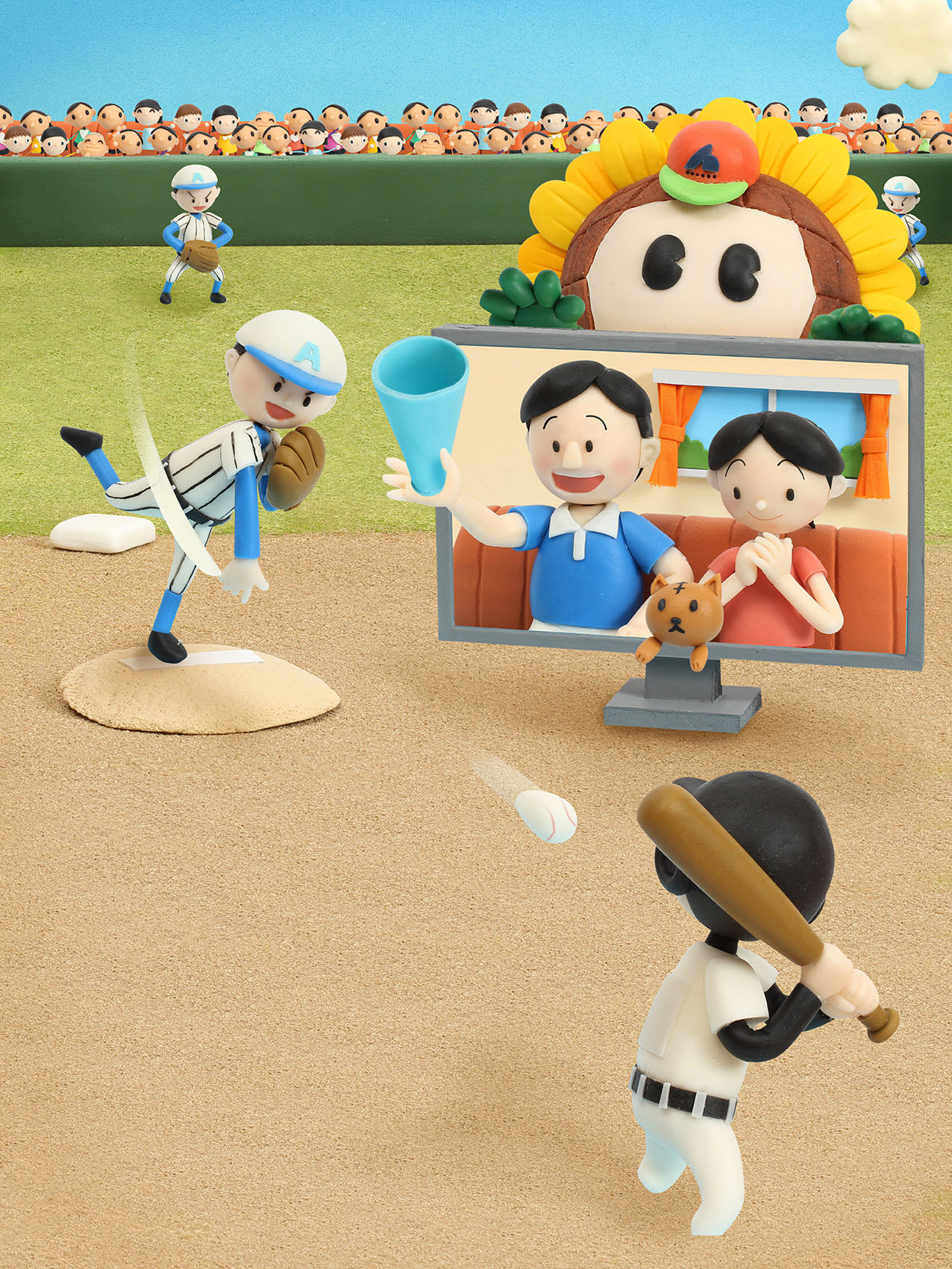 ひまわりネットワークさまの新聞広告・6月号ビジュアルとして制作されたクレイアート作品。テーマは「地元の高校野球テレビ番組放送」。地域に密着し、高校球児たちの熱戦を地方予選から中継するひまわりネットワークの姿勢を、臨場感あるジオラマ構成で表現しています。グラウンドで戦う球児たち、テレビ越しに応援する視聴者、それを見守る“ひまわりくん”の姿を通して、「地域の情熱と絆を届ける放送局」というメッセージを立体的にデザインしました。ウォルナッツ・クレイワークスタジオがビジュアルデザイン(イメージラフ・レイアウト設計)から立体造形・照明・撮影・編集までを一貫して担当しています。