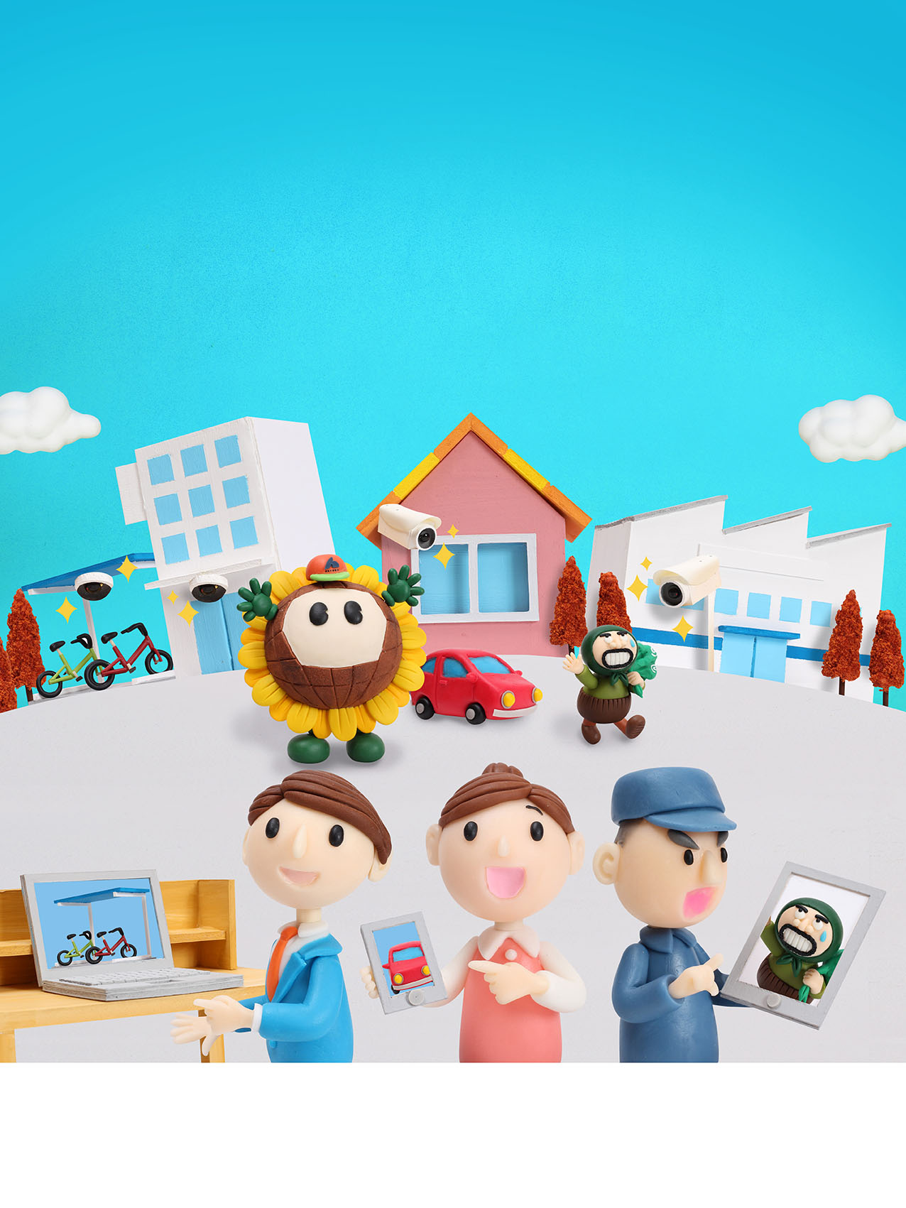 本作は、「クレイアート × 防犯 × 地域安全」をテーマに、防犯カメラを通して“街全体を見守る安心のネットワーク”を描いた立体広告ビジュアルです。ウォルナッツ・クレイワークスタジオの精密な造形と構成により、テクノロジーと人の温かさが共存する“安全でやさしい街の姿”をユーモアとクラフト感で表現しています。