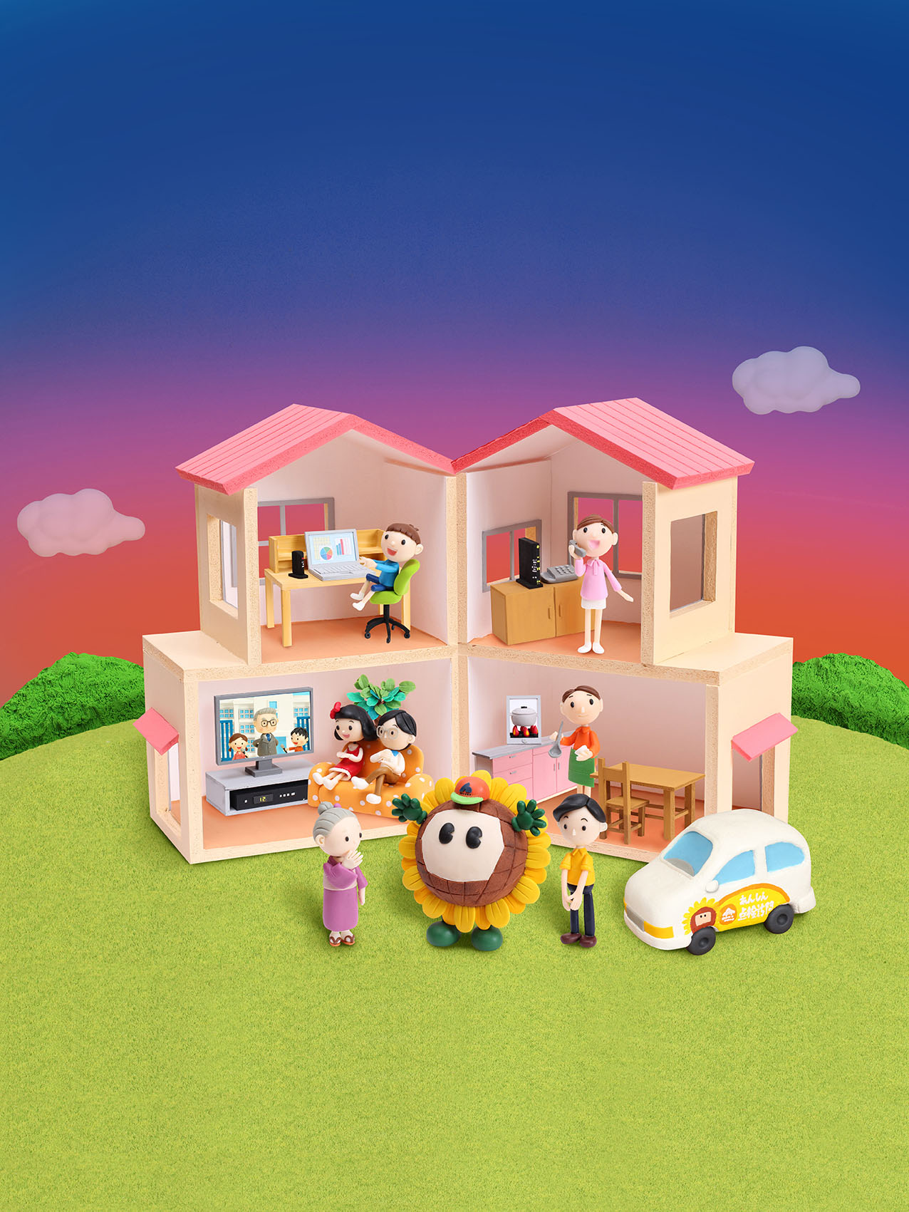 本作は、「クレイアート × 家族 × 生活サポート」をテーマに、“ひまわりネットワークが支える安心で快適な暮らし”を表現した立体イラスト作品です。ウォルナッツ・クレイワークスタジオの細やかな造形と光の演出により、家庭のあたたかさと技術の共存を描いた、心に残る広告ビジュアルとして完成しました。