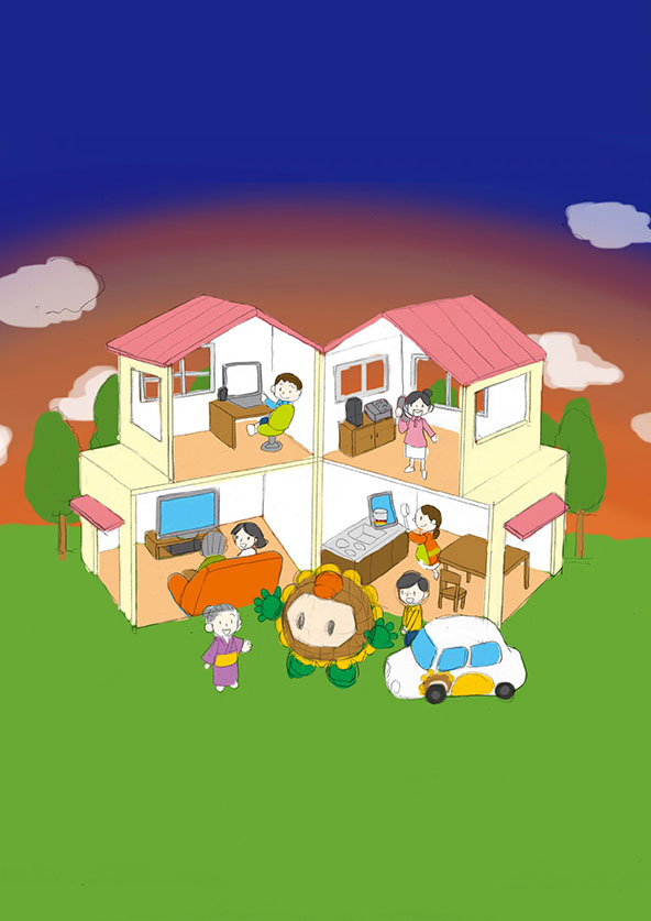 ひまわりネットワークさまの新聞広告・12月号ビジュアルとして制作されたクレイアート作品。テーマは「家族みんなでひまわりネットワーク」。家族がそれぞれの部屋で快適に過ごす様子を通して、“ひまわりネットワークが支える豊かな暮らし”を温かく描いています。インターネット、電話、防犯、専門チャンネルなど、生活を便利にするサービスが家庭の中で自然に活用されている様子を、ドールハウス形式の立体セットで表現しました。ウォルナッツ・クレイワークスタジオがビジュアルデザイン(イメージラフ・レイアウト設計)から立体造形・照明・撮影・編集までを一貫して担当しました。