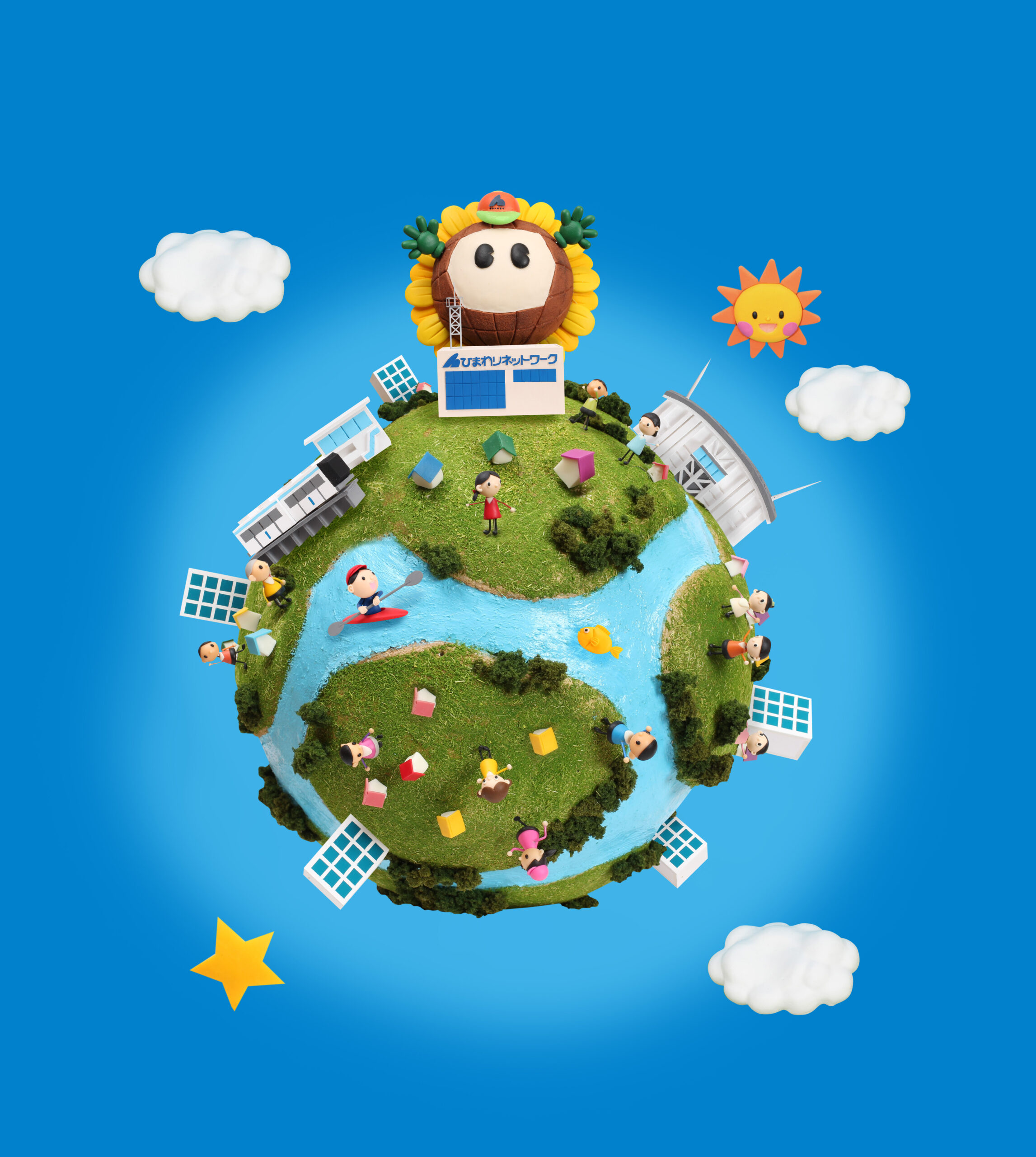 ひまわりネットワークさまの新聞広告・1月号ビジュアルとして制作されたクレイアート作品。テーマは「地域の生活の中にひまわりネットワーク」。地域全体を地球儀型のジオラマで表現し、ひまわりネットワークのサービスが“街にも、家庭にも、企業にも”浸透している様子を立体的に描いています。ウォルナッツ・クレイワークスタジオが、ビジュアルデザイン(イメージラフ・レイアウト設計)から立体造形・照明・撮影・編集までを一貫して担当しました。