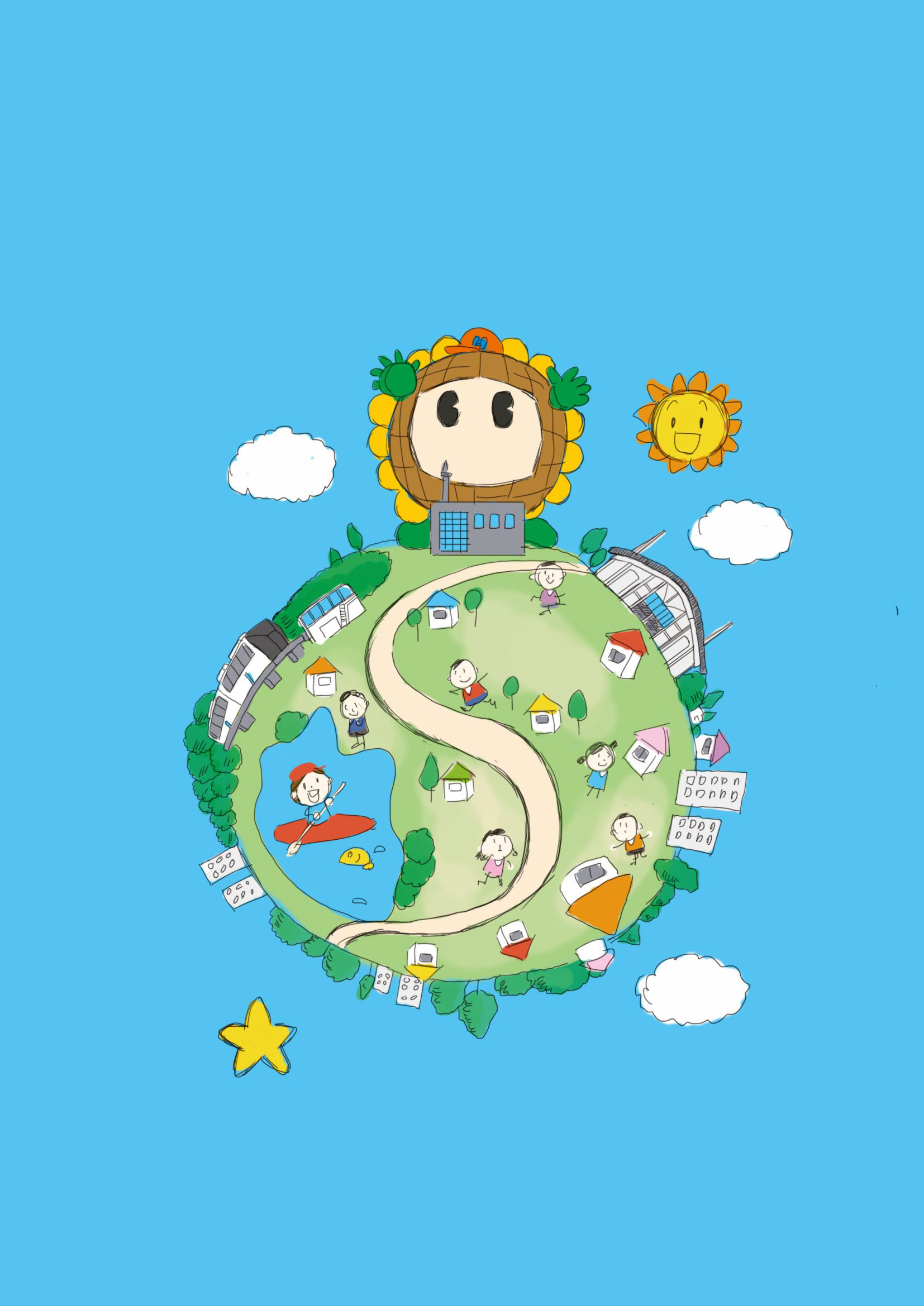 中心に配置された地球儀型のミニチュアセットは、スチロールをベースに樹脂粘土・軽量粘土で制作。都市部のビル群から住宅地、個人の暮らしまでをスケールバランスよく配置し、地域の多様性をひとつの球体世界として再構築しました。周囲には太陽と星を配置し、「昼と夜がつながる街」のイメージを演出。企業や家庭のミニチュアはすべて手作業で造形し、ひまわりネットワークの“1日中寄り添う安心感”を象徴的に表現しています。