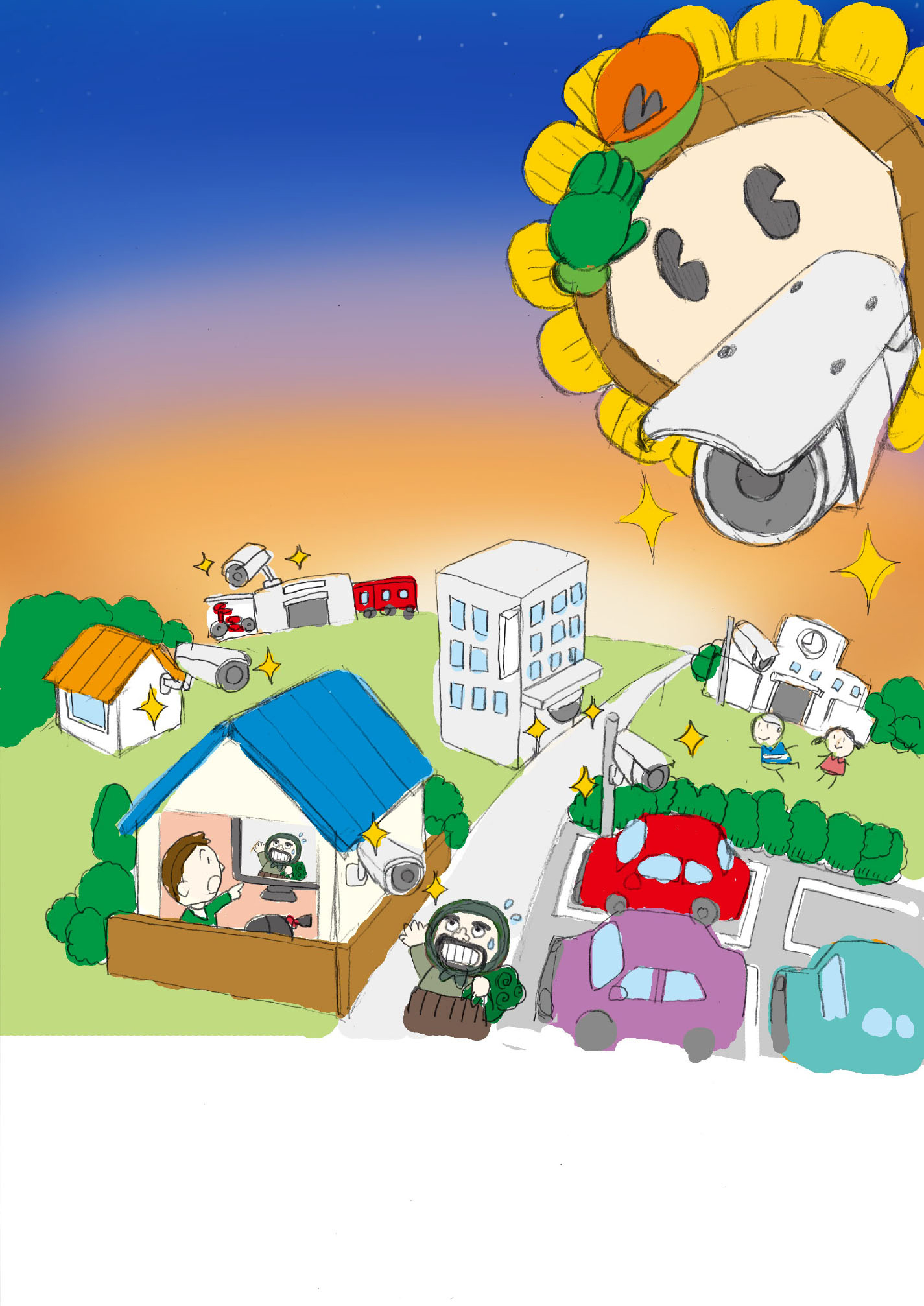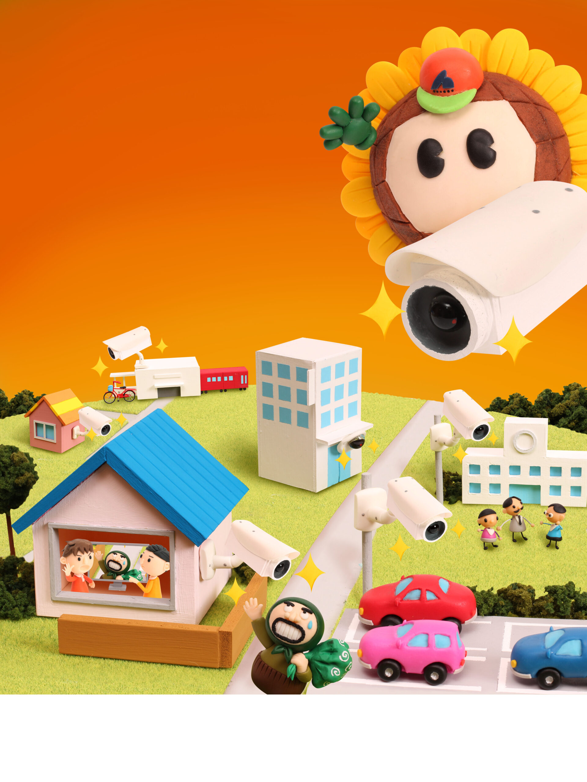 本作は、「クレイアート × 防犯 × 地域安全」をテーマに、“街全体をやさしく見守るひまわりネットワーク”を表現した立体広告ビジュアルです。ウォルナッツ・クレイワークスタジオの繊細な造形と光の演出により、テクノロジーと人の安心が共存する“あたたかな防犯アート”として完成しました。