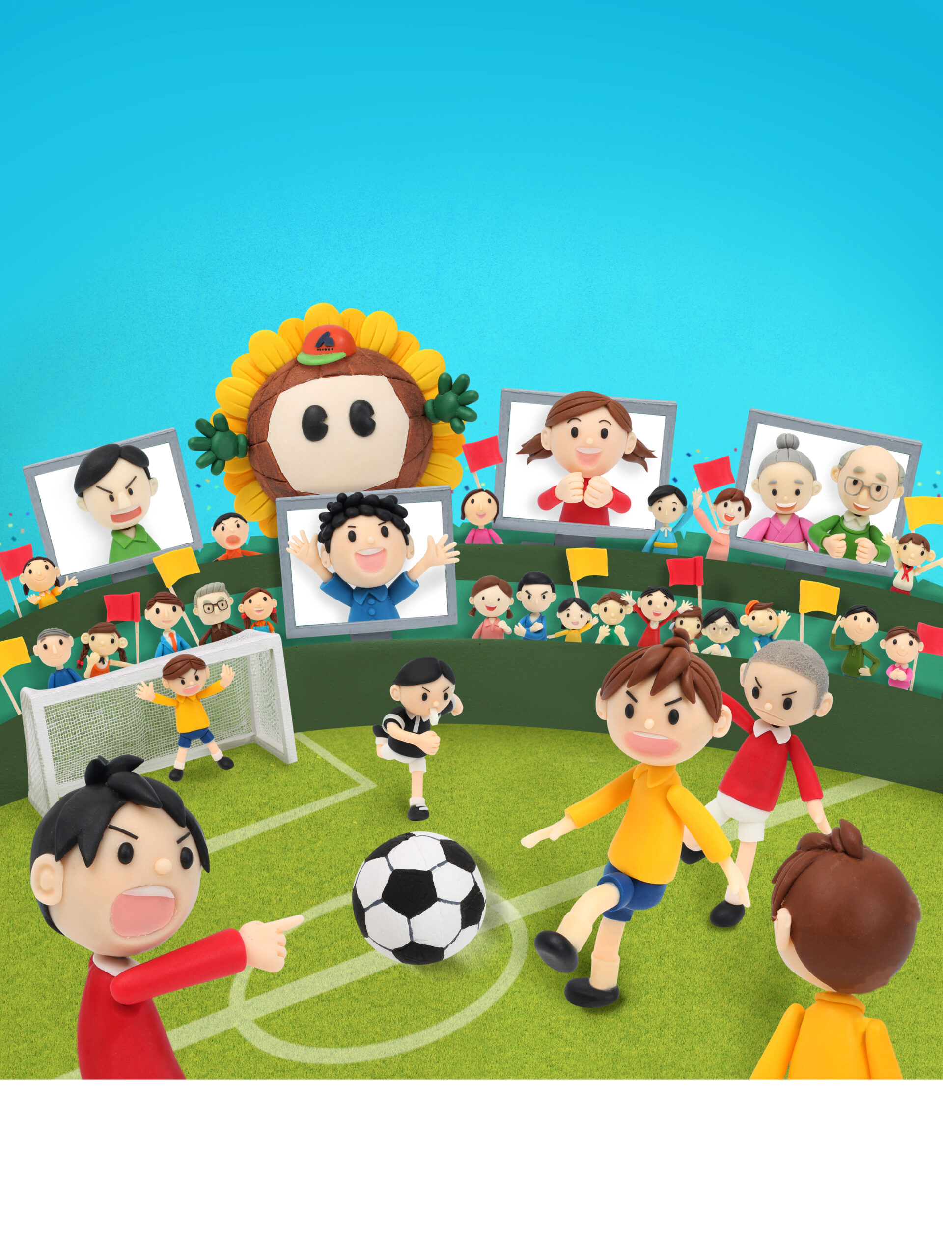 強めのストロボ照明を使用し、秋の午後の太陽をイメージした自然なコントラストを再現。広角レンズでフィールド全体をとらえながら、クローズアップで選手の表情を切り取ることで、粘土造形の立体感と緊張感を両立させました。観客やモニターの配置によって、試合会場と家庭が一体化する構成を演出し、視覚的にも「地域が一緒に戦っている」印象を与えています。