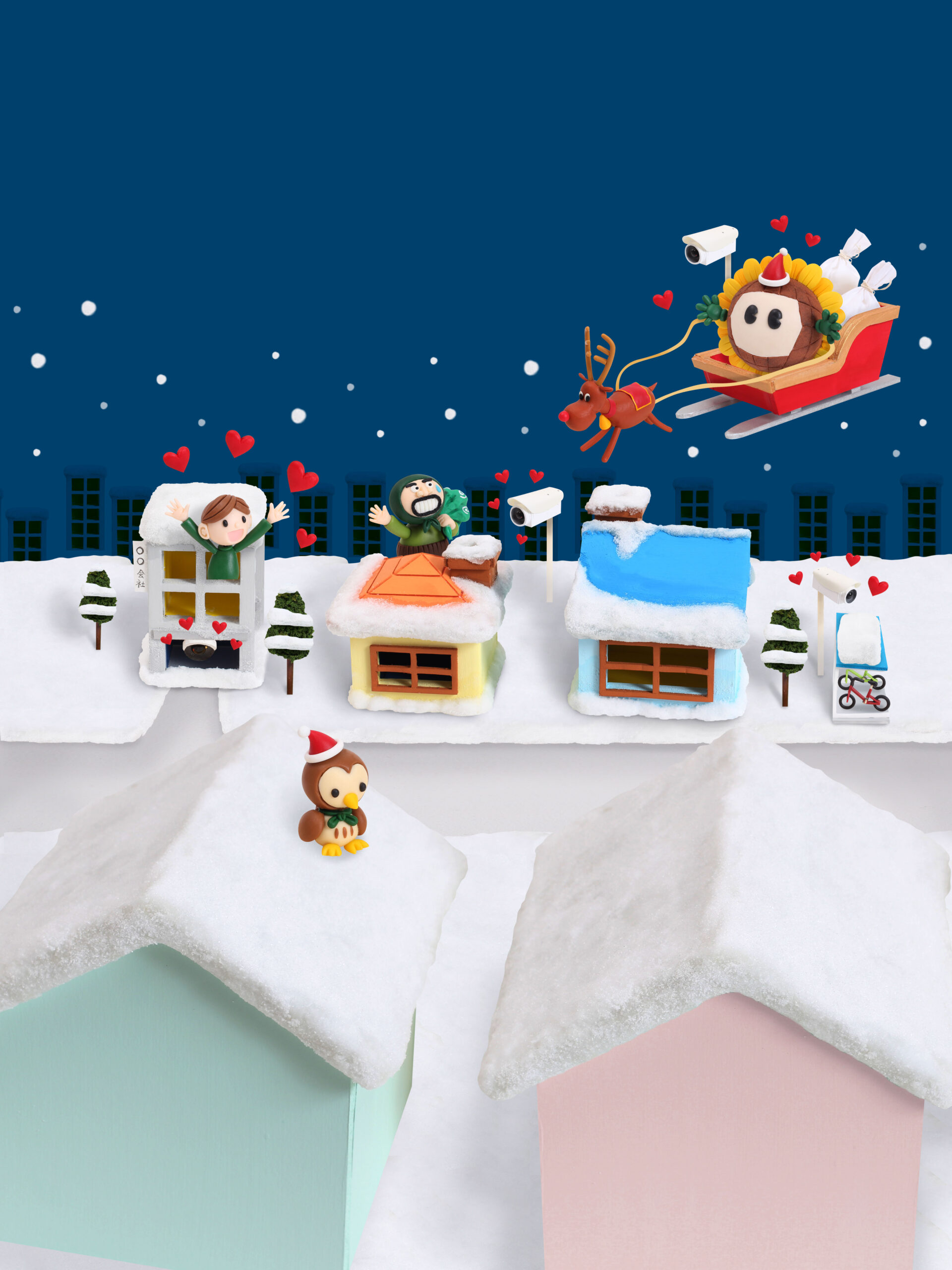 本作は、「クレイアート × 防犯 × クリスマス」をテーマに、地域の安全と温かな季節感を融合させたキャラクタービジュアル作品です。 雪の質感や光の演出など、すべてを手作業で作り上げた立体表現により、“安心と優しさを届けるひまわりネットワーク”のメッセージをやさしく伝える広告ビジュアルとなりました。