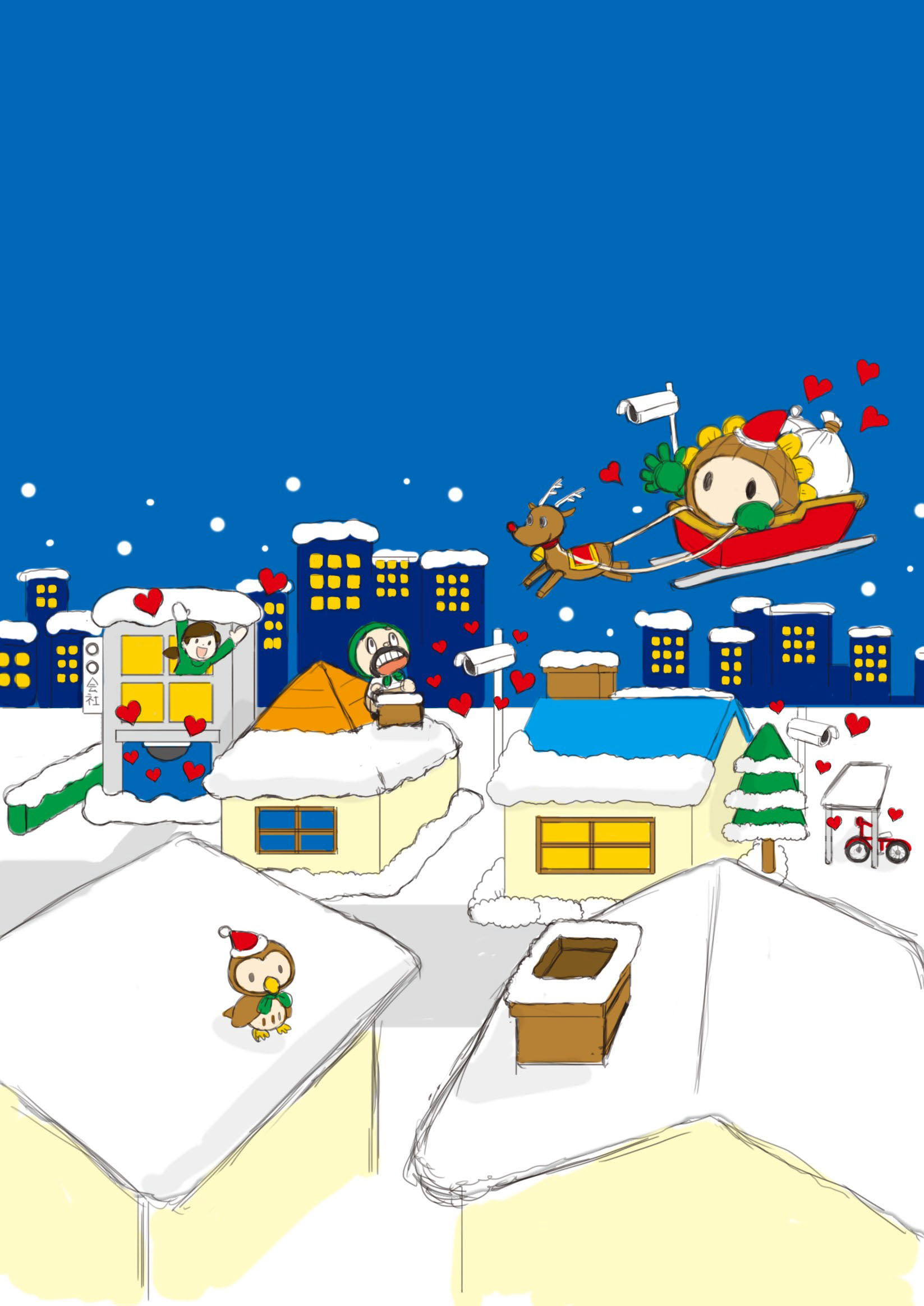 12月、雪の降り積もるクリスマスの街を舞台に、「ひまわりネットワークが地域の安心を届ける」というメッセージを込めたビジュアルデザイン。夜空を駆ける“ひまわりサンタ”が、雪に包まれた家々の上を飛びながら、人々の安全を見守るシーンを構成しています。街全体が静けさと温もりに包まれ、クリスマスの華やかさと“防犯”という社会的メッセージが自然に溶け合うように設計されています。