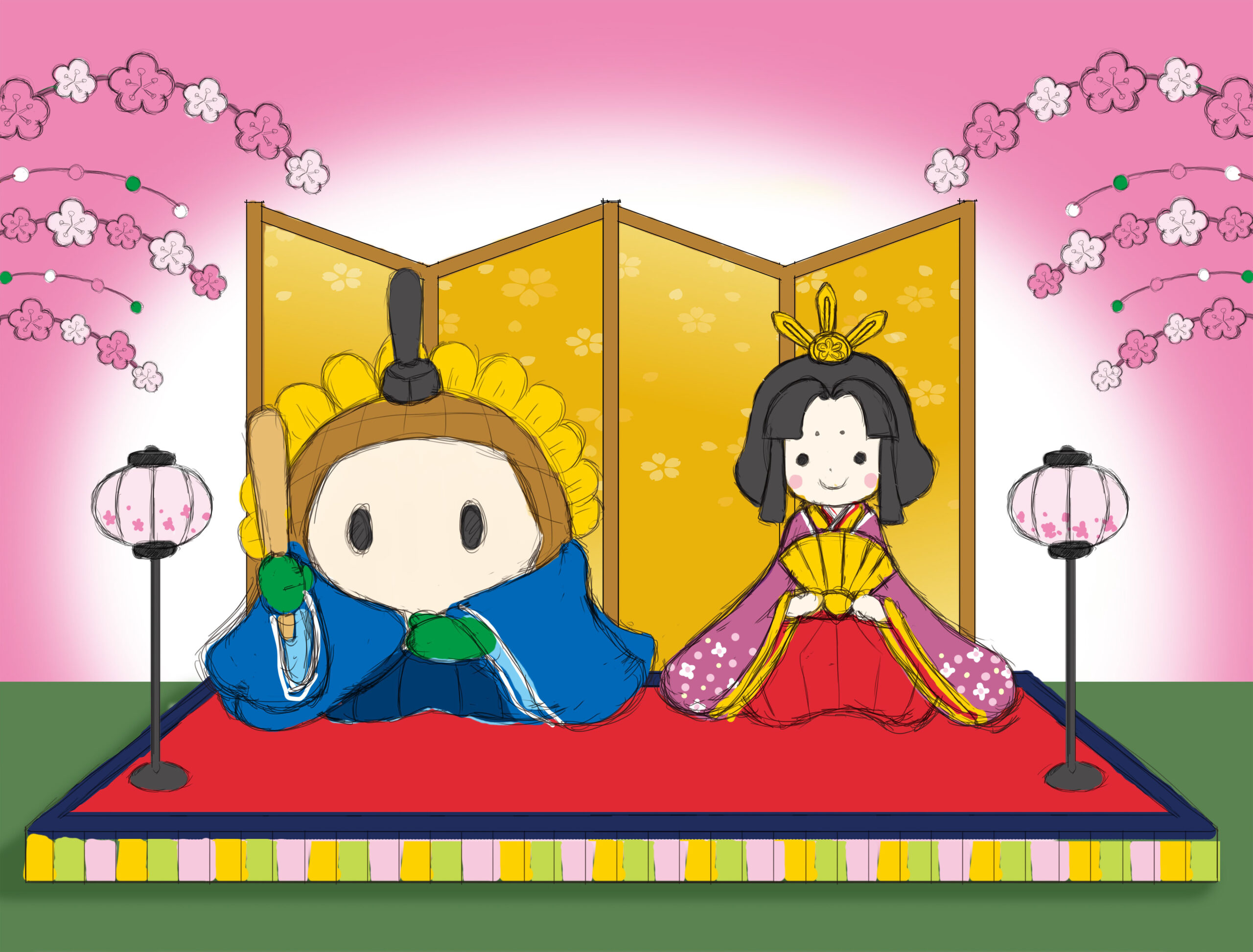 3月の季節行事「ひな祭り」を題材に、春のやわらかな空気と祝祭感を表現。中央には“ひまわりくん”を男雛としてデザインし、鮮やかな衣装と満面の笑顔で季節の訪れを祝います。背景には、ぼんぼりの明かりや花飾り、衝立を配置し、桃の節句らしい華やかな空間を構成。 “春を待つ喜び”と“地域の温もり”を感じさせる、柔らかな色彩設計となっています。