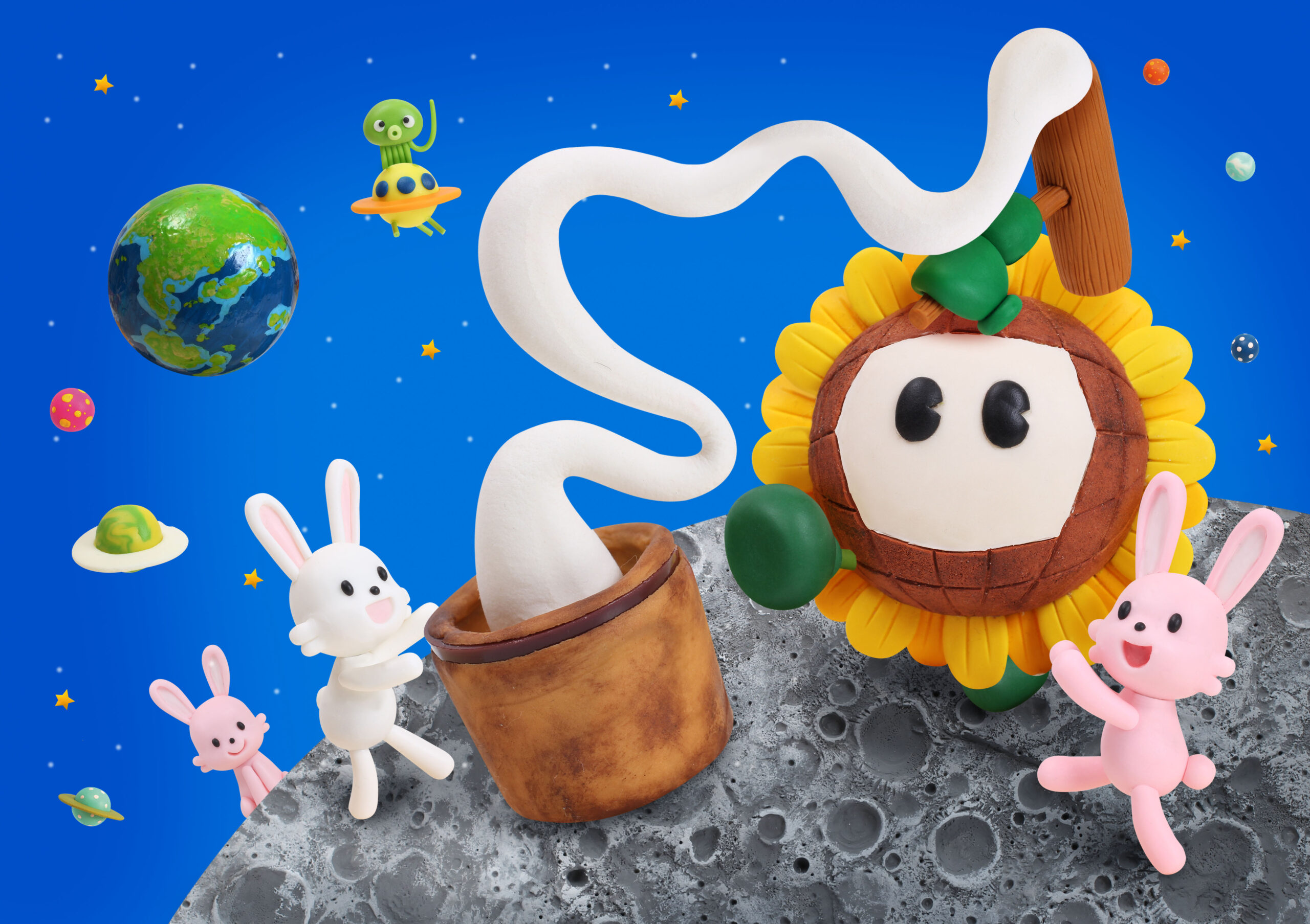秋の夜空と月を舞台にした“お月見”の幻想的な世界を、ユーモラスに立体表現したクレイアート作品。宇宙空間に浮かぶ月の上で、ひまわりくんとうさぎたちが一緒にお餅をつくという物語的な構図で構成。 背景には地球を配置し、月面から見上げた“地球の美しさ”と“地域のつながり”を象徴的に描いています。秋のイベント「中秋の名月」を、キャラクターとジオラマの温かみで再解釈したビジュアルです。