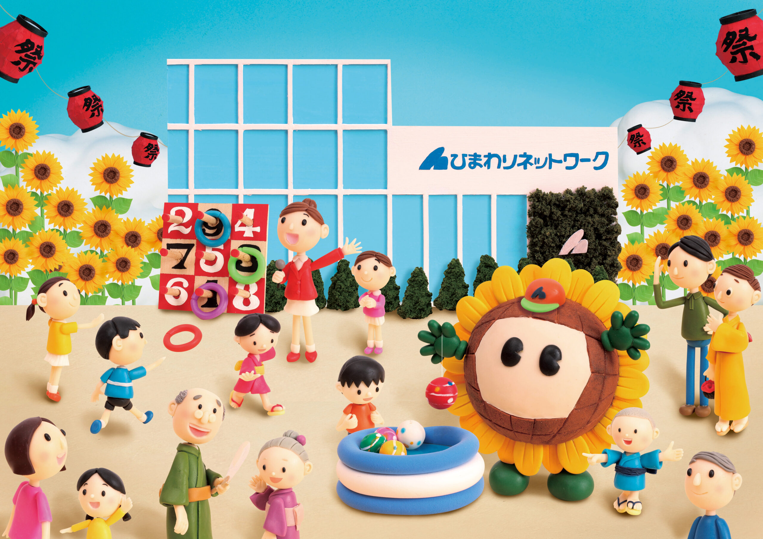 夏の風物詩“縁日”をモチーフに、地域の交流とつながりを明るく描いたクレイアート作品。ひまわりネットワークが主催する地域の夏祭りをイメージし、老若男女の住民が輪投げやヨーヨー釣りなどを楽しむ様子を、温かく賑やかに表現しました。背景には本社ビルを配置し、企業と地域が共に過ごす夏の一日を象徴する構成としています。“ひまわり”をモチーフにした装飾や色彩で、ブランドアイデンティティと季節感を融合させたデザインになっています。