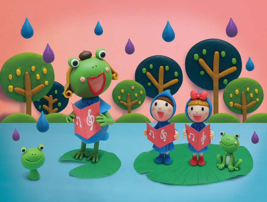 ■6・7月:カエルさんと一緒に歌の練習 梅雨の季節をテーマに、カエルと子どもたちが睡蓮の葉の上で合唱するシーンを立体的に構成。カラフルな水玉の雨は粘土で一つずつ成形し、空から降るリズムを楽しく表現しています。木々はデフォルメを効かせた粘土造形で背景に配置し、温かみのある空間に。さらに、楽譜を紙素材で制作するなど、異素材の組み合わせで“雨の日の音楽会”のような楽しい世界を演出しています。