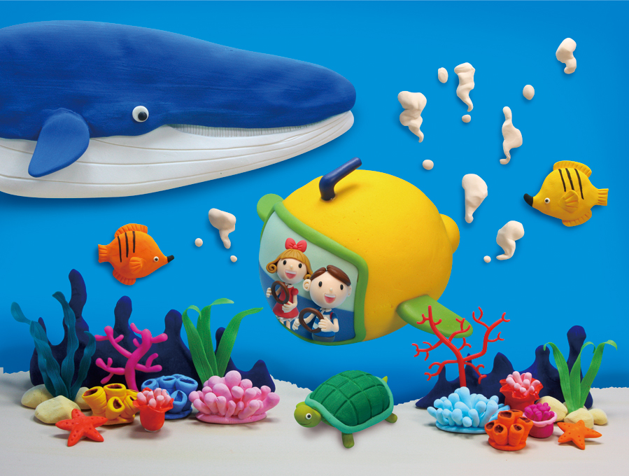 ■8・9月:海の中を潜水艦で探検 夏の海を舞台に、潜水艦に乗った子どもたちが冒険する情景をクレイアートで再現。カラフルな魚、サンゴ、イソギンチャクなどをアクリルガッシュで彩色し、鮮やかな海の生態系を立体的に表現しています。大きなクジラは平面立体で造形し、子どもにも分かりやすいフォルムにデザイン。粘土細工の立体と平面を組み合わせ、水の中の奥行きと広がりを感じるよう設計された作品です。