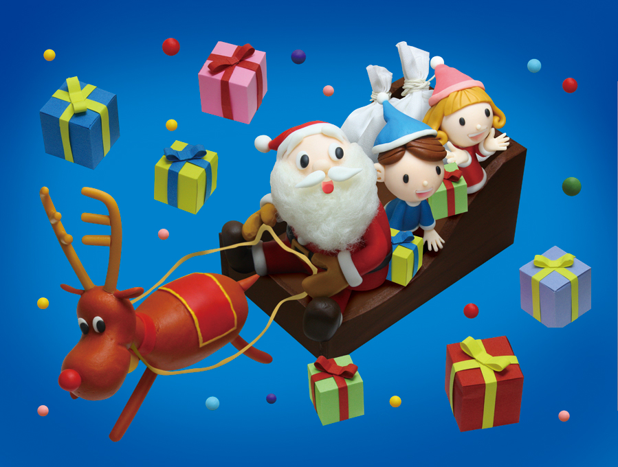 ■12月:サンタさんのお手伝い クリスマスをテーマに、プレゼントを運ぶ子どもたちとサンタクロースの姿を描いた作品。サンタの顎ひげには羊毛フェルト、プレゼントの箱には紙、袋には布を使用し、素材の異なる質感を活かしたクラフト感のある構成です。夜の街へとプレゼントを届ける温かな光景を、粘土の柔らかい質感と手作りの温もりで表現しました。