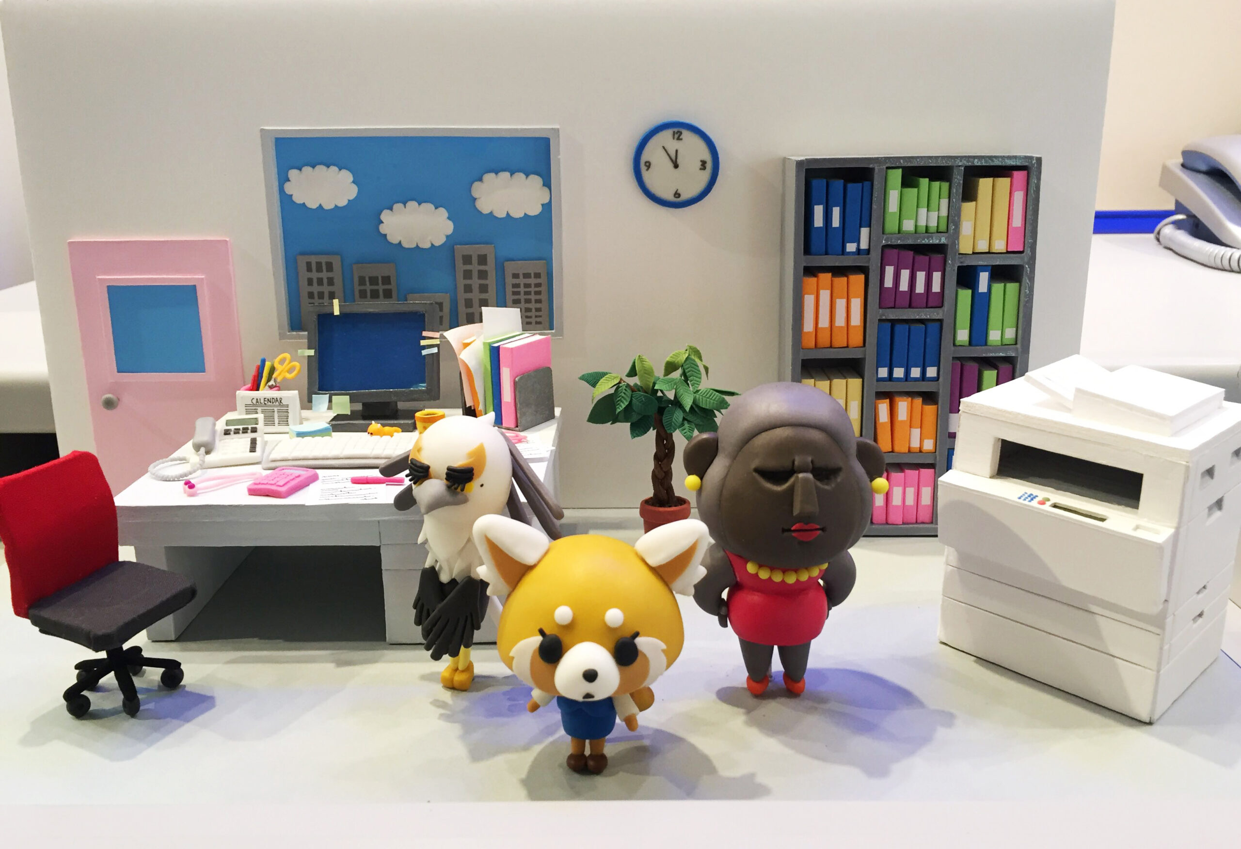 サンリオEXPO展示会にて、『アグレッシブ烈子』の世界観を立体的に再現したオフィスジオラマを制作しました。ウォルナッツ・クレイワークスタジオが企画・設計デザイン・造形・展示演出・撮影までを一貫して担当。アニメの魅力をリアルな“空間体験”として来場者に届ける、キャラクター展示用のミニチュアジオラマアートです。