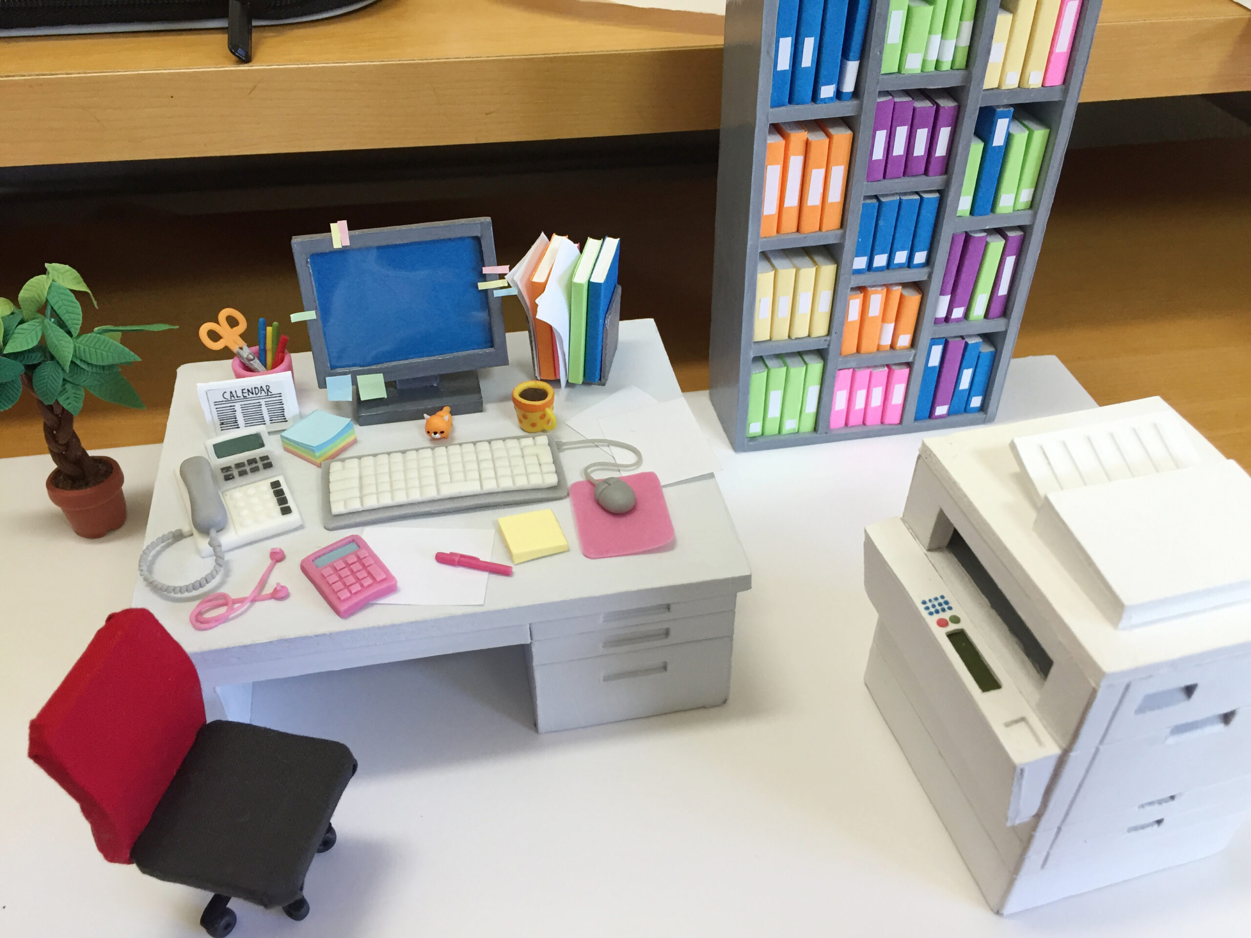 空間レイアウトから素材設計までスタジオ内で独自にプランニング。 キャラクターサイズに合わせてオフィスデスクやチェア、電卓、電話、時計、文具などをスチロールと樹脂粘土で設計・制作。メモ用紙は実際に文字を書き込み、パソコンモニターには手作業で付箋を貼るなど、実際の職場の空気を細部まで再現。コピー機や棚、本、時計などもアニメの美術設定をもとに立体化し、アニメ × ミニチュア × クレイアートが融合した展示表現となっています。