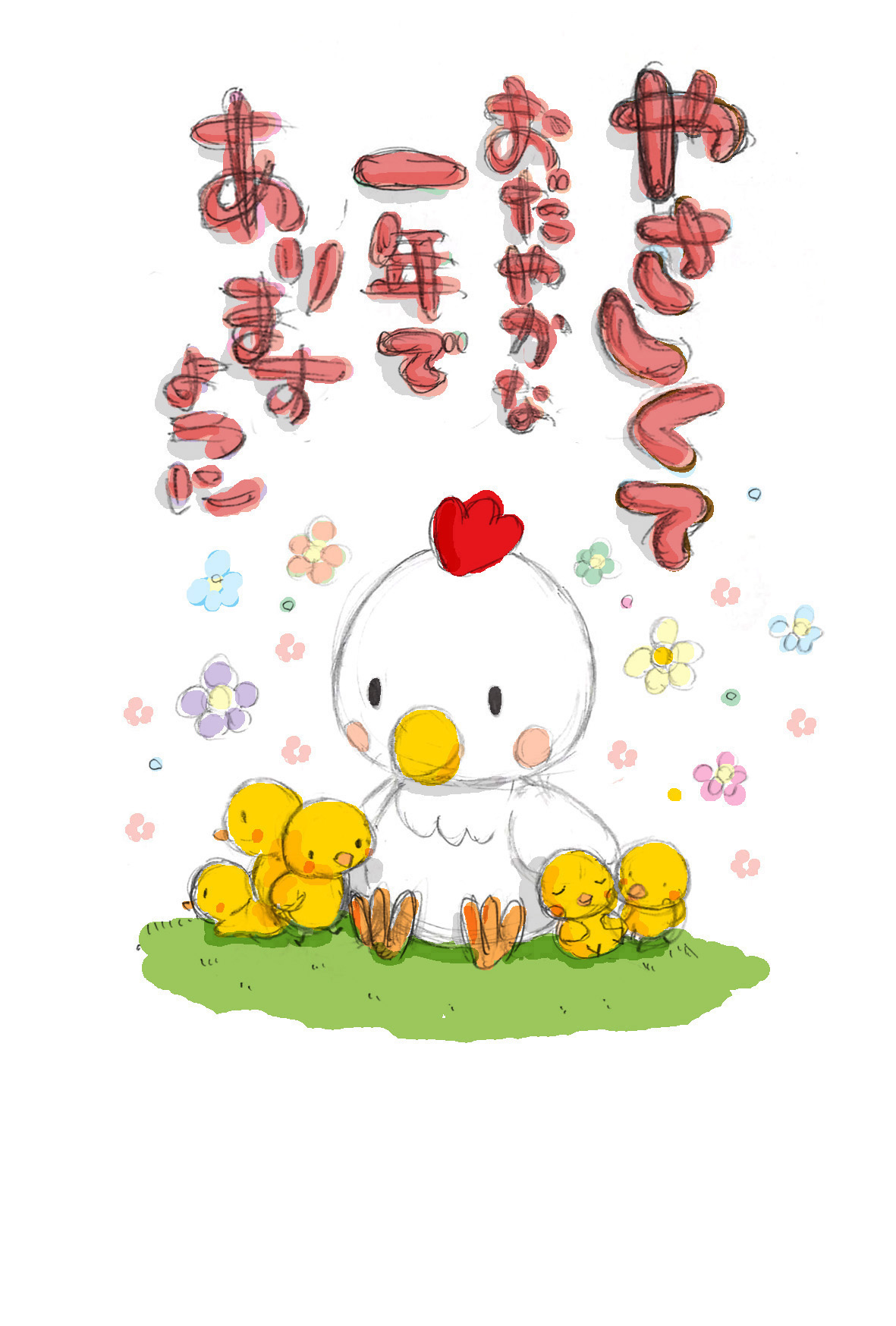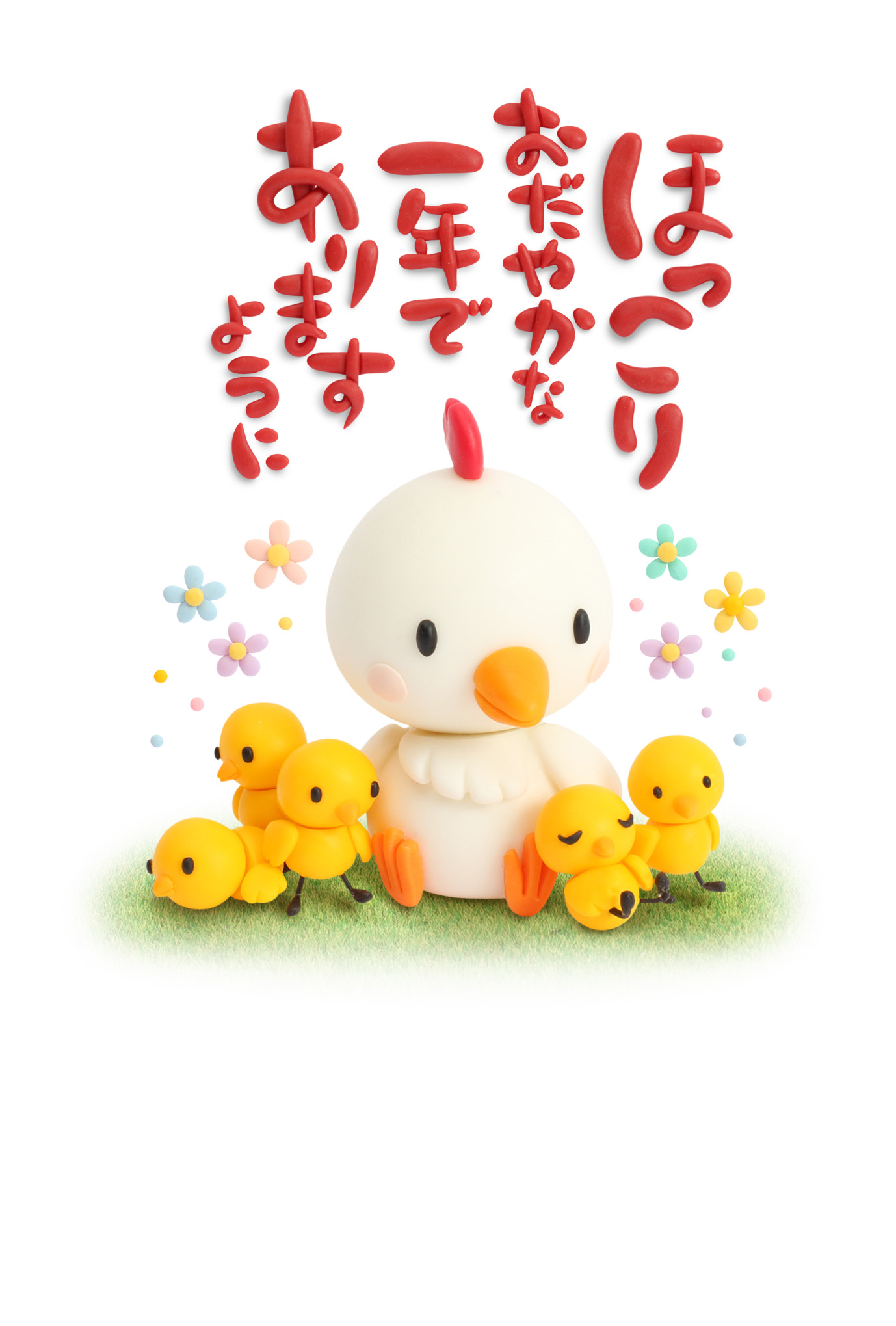 ファミリー向けの年賀状ビジュアルとして、「ニワトリのお母さんに甘えるひよこたち」という構図をテーマに制作しました。お母さんは優しい表情で子どもたちを見守り、ひよこたちは寄り添ったり芝生に寝転んだりと、家族のぬくもりと絆を感じさせる穏やかな世界を描いています。全体のビジュアルデザインは、見た瞬間に“かわいい”と感じられるよう、丸くころんとしたフォルムのキャラクター造形を採用。 背景は白地に淡いパステル調の花をレイアウトし、清潔感とやさしさを両立したデザインに仕上げています。さらに、“ほっこりと穏やかな一年でありますように”という文字を粘土で立体造形し、年賀状としてメッセージ性の高い、キャッチーなデザインに仕上げました。
