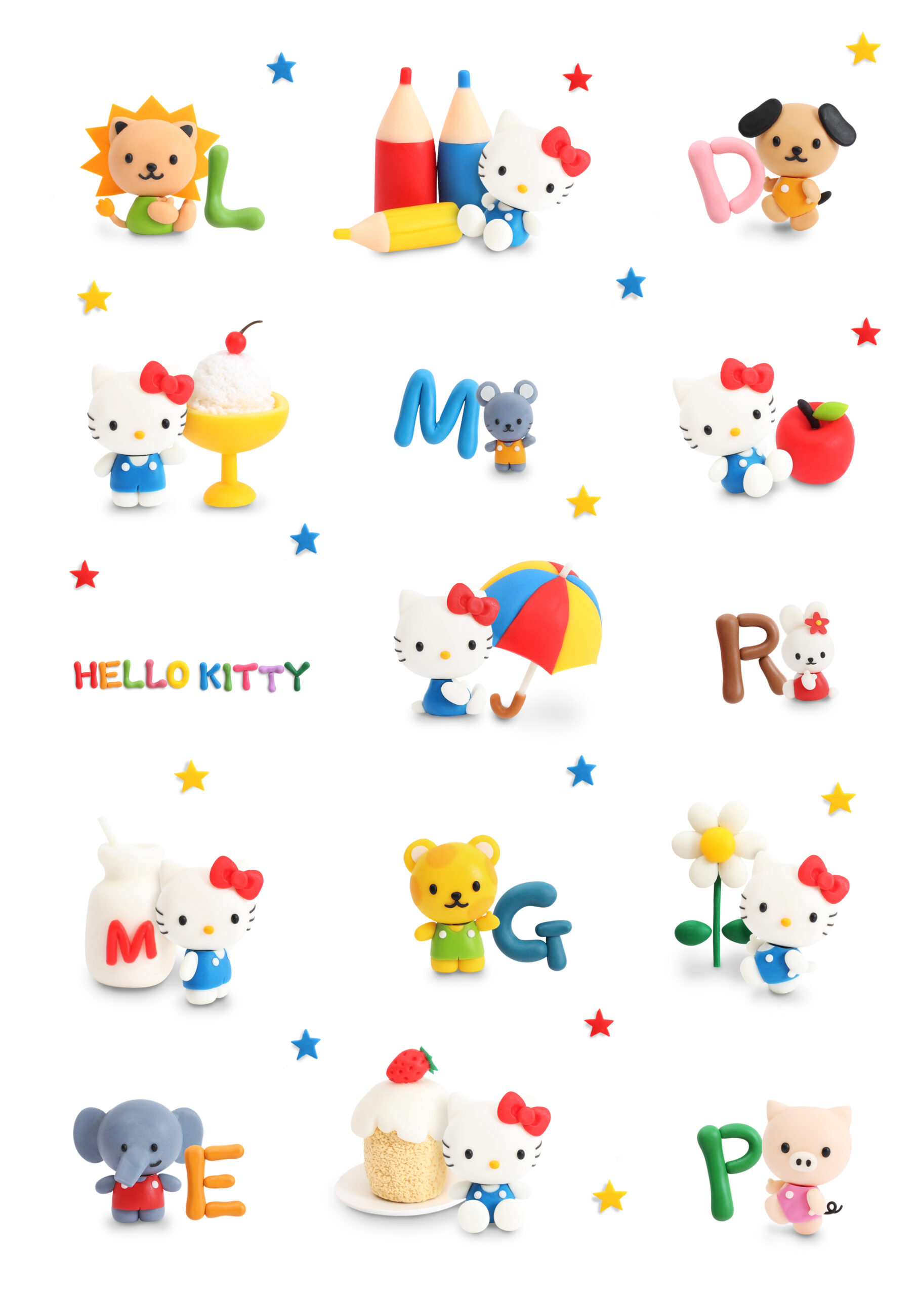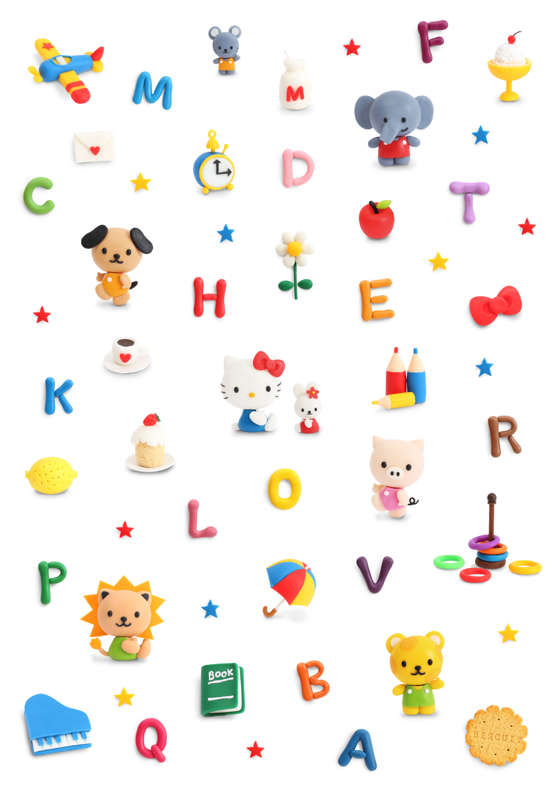 「ハローキティとその仲間たち」をドットパターンのように配置し、見ているだけで笑顔になるビジュアル構成に。ハローキティを中心に、ブタさん、ゾウさん、ネズミさん、ライオンさんなど、フレンドリーな仲間たちを樹脂粘土で丁寧に造形。散りばめられたリボン・えんぴつ・ケーキ・星などの小物もすべて手づくりの粘土細工で制作し、キャラクターたちの個性を引き立てています。A〜Zまで続くアルファベットパーツも粘土で制作し、組み合わせによって多様なレイアウトが可能な“パターンビジュアル”として構成されています。