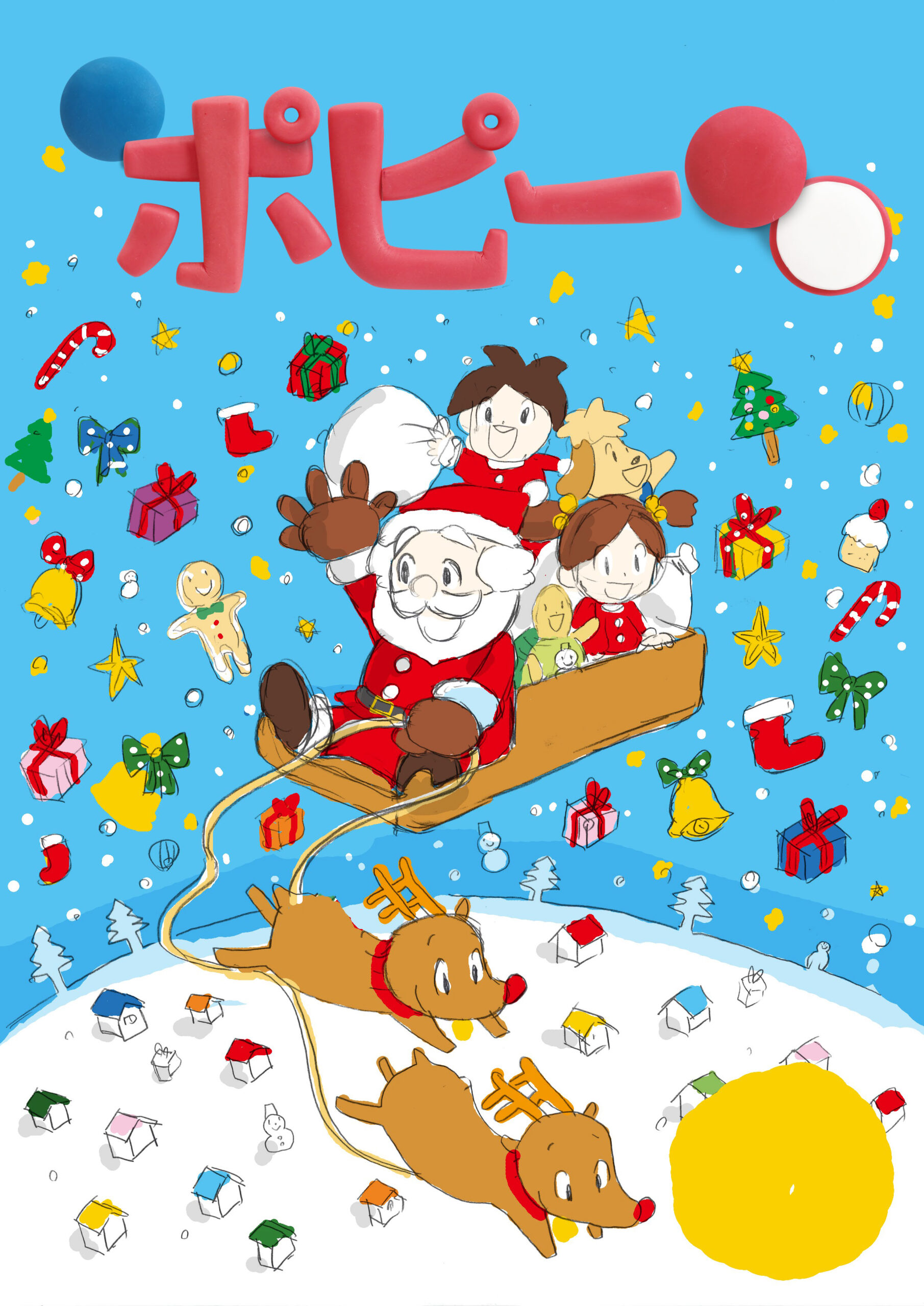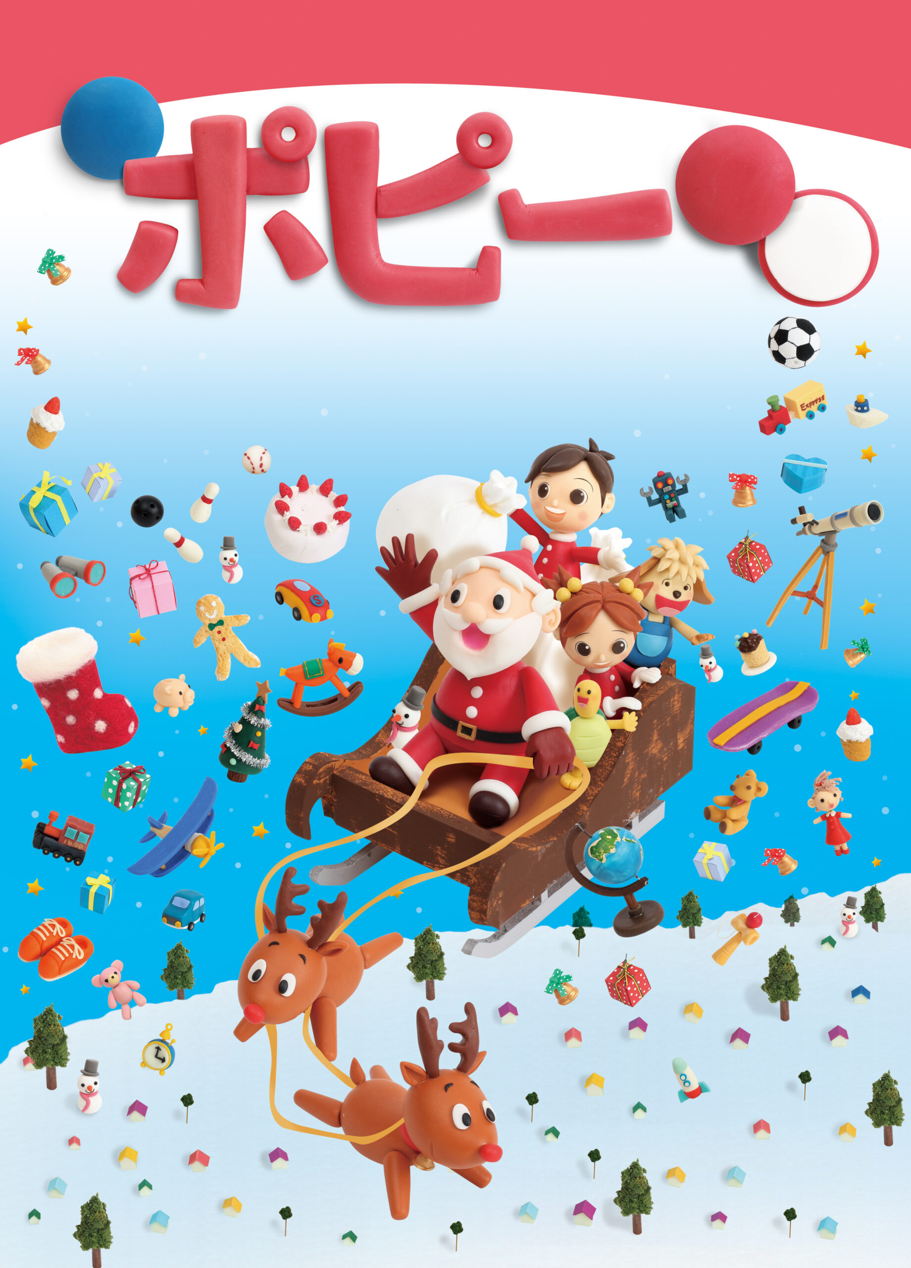 小学ポピー『1・2年生』2017年12月号の表紙ビジュアルを、クレイアート(粘土立体イラスト)で制作しました。テーマは「クリスマス!サンタと一緒にプレゼントを届けよう!」。雪に包まれたミニチュアの街を舞台に、サンタクロースとキャラクターたちが空を飛びながらプレゼントを届ける様子を表現。空には粘土で制作したおもちゃが散りばめられ、誌面全体がクリスマスの夢とワクワクで包まれています。 ウォルナッツ・クレイワークスタジオが、企画、ビジュアルデザイン、立体造形、照明・撮影、編集までを一貫して担当。冬の色彩ときらめきを融合させた、季節感あふれる教材表紙用クレイアート作品です。