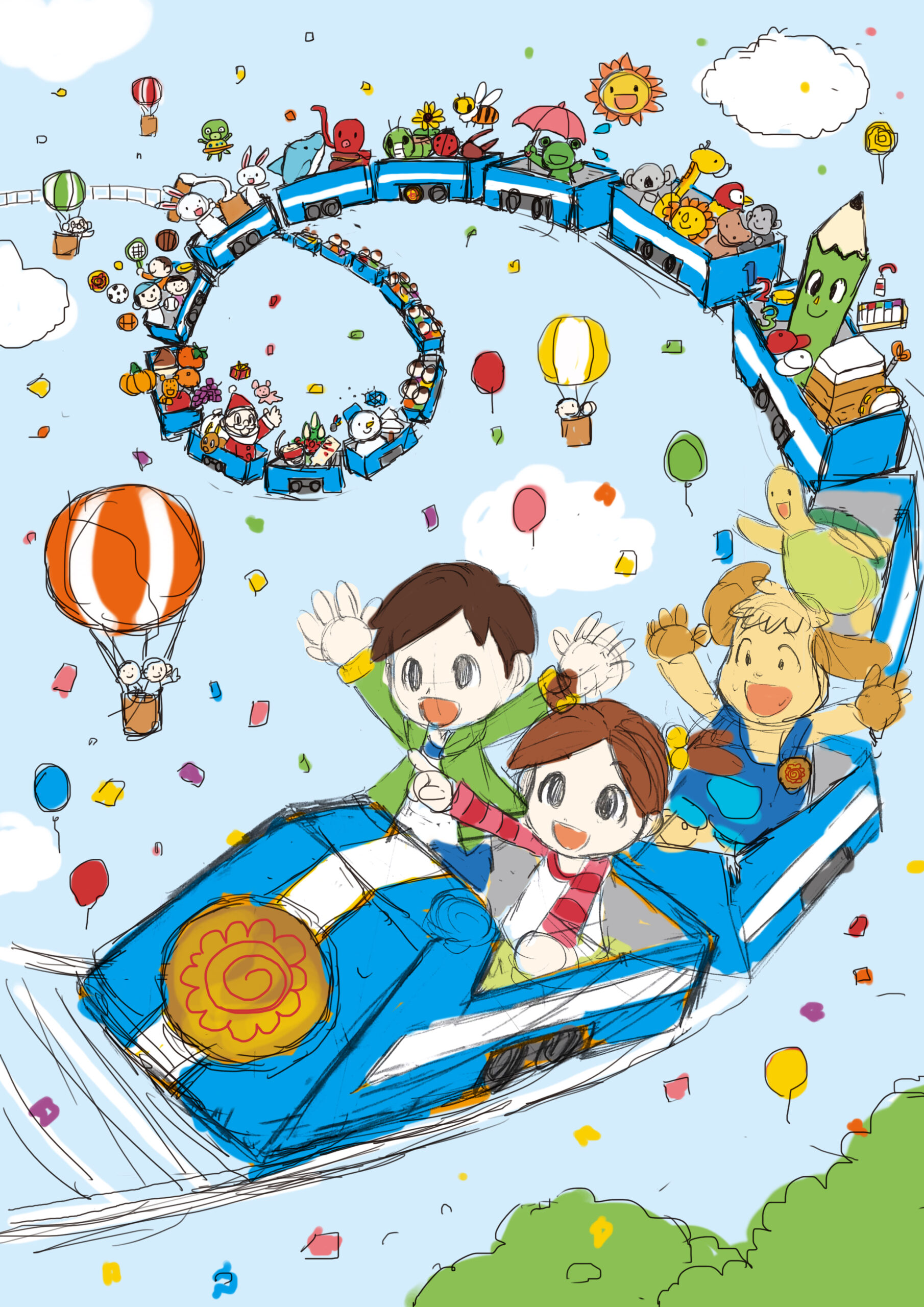 3月号は“みんなで次の学年へ出発!”をテーマに、ジェットコースターが青空へと駆け上がる構図で制作しました。車両にはこれまでの表紙で登場したキャラクターたちが勢ぞろいし、1年間の学びと成長を象徴しています。空へと向かうレールの先には希望を、足もとのミニチュアジオラマには学校や緑の丘を配置し、“出発と再会”の物語を感じさせるデザインです。さらに、誌面には「ひまわりコインが隠されているよ。探してみよう!」という探し絵の要素も盛り込み、子どもたちが表紙を見ながら楽しめる仕掛けになっています。