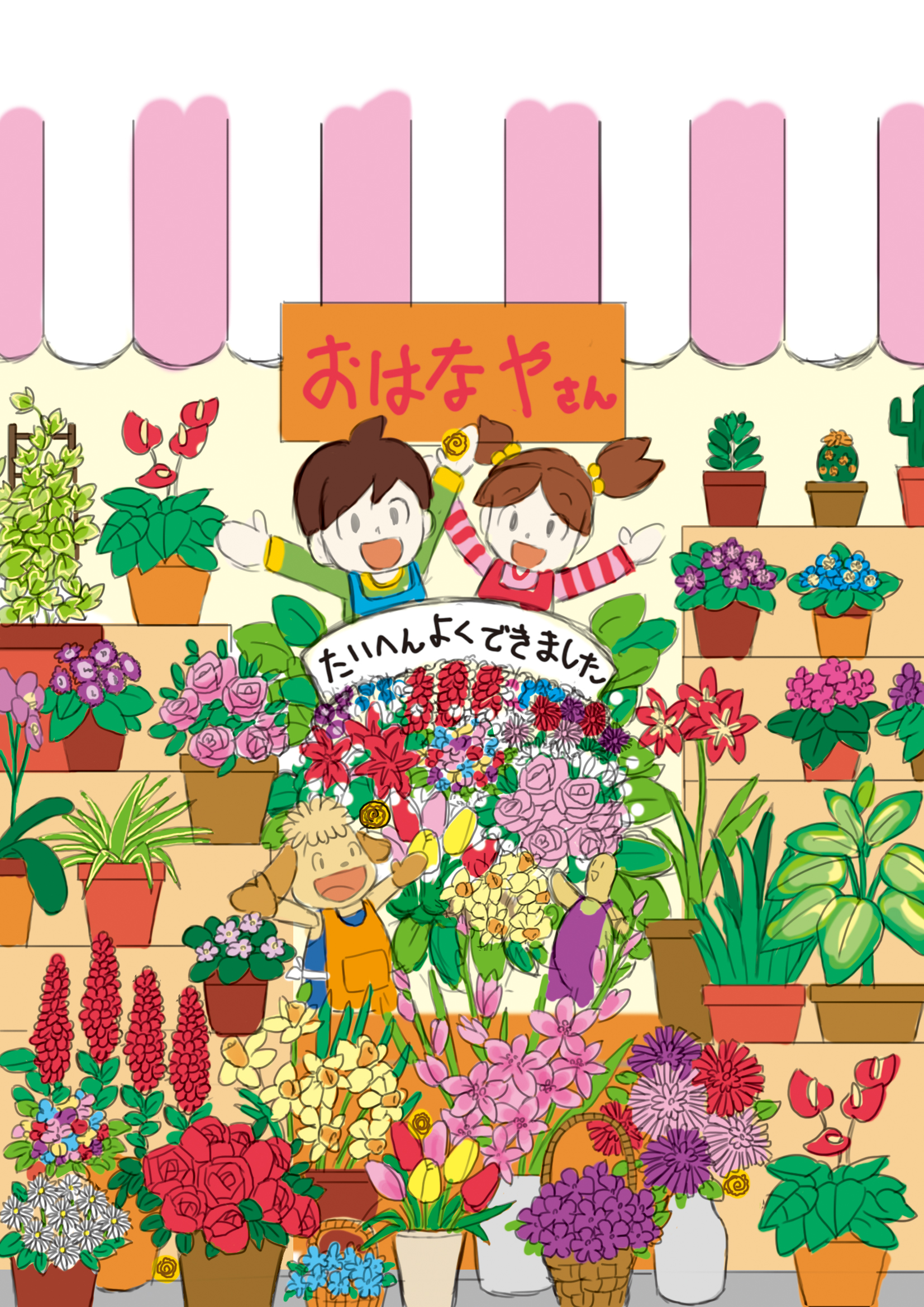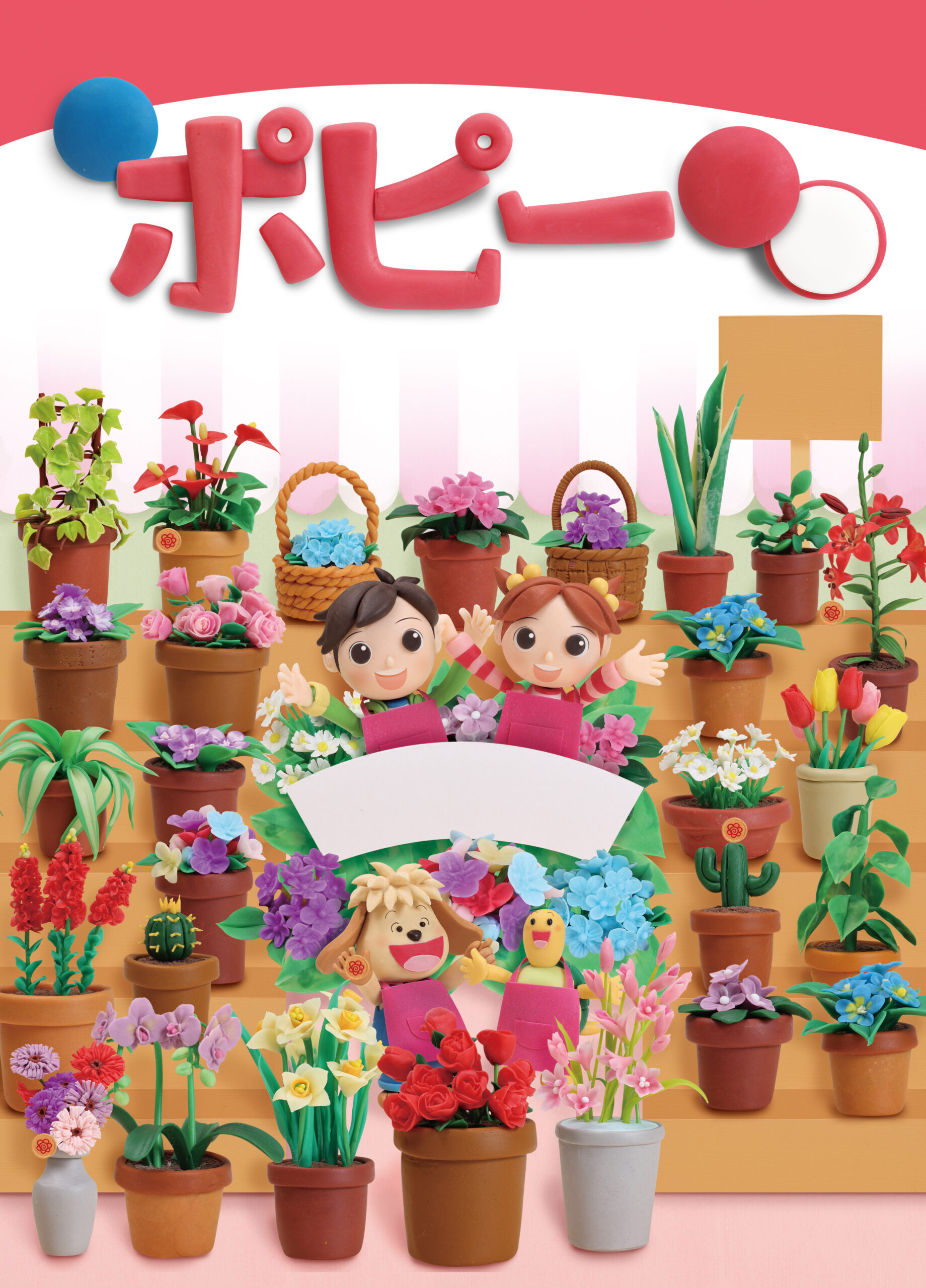 舞台は春の陽ざしが差し込むドールハウス型の花屋さん。カウンターや棚、窓際の鉢植えスペースまで丁寧に設計され、誌面全体に数百種類のミニチュアフラワーとグリーンが所狭しと並べられています。キャラクターたちはエプロン姿で花束を作ったり、鉢植えを並べたりと、花屋さんとして生き生きと働く姿を描写。背景には春の風を感じるような光が差し込み、見る人に“卒園・進級”の喜びを伝える暖かな色彩構成でまとめています。