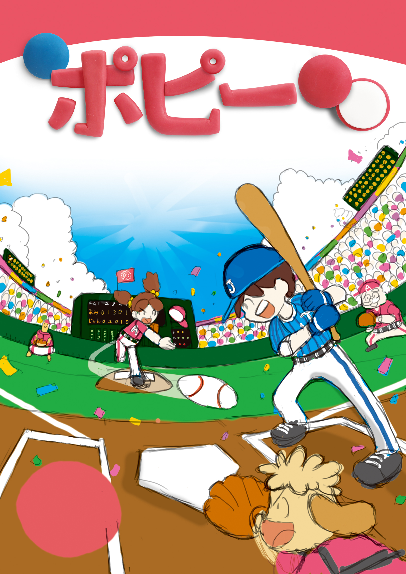 小学ポピー『1・2年生』2019年7月号の表紙ビジュアルを、クレイアート(粘土立体イラスト)で制作しました。年間テーマ「2020東京オリンピックに向けて、スポーツを知ろう!」シリーズの一環として、7月号では“野球”を題材にしたダイナミックなジオラマ構成を展開。ウォルナッツ・クレイワークスタジオが、企画デザイン・造形・照明・撮影・編集・DTPデザインまでを一貫して担当し、夏らしい爽快感とスポーツの熱気を立体的に表現しています。