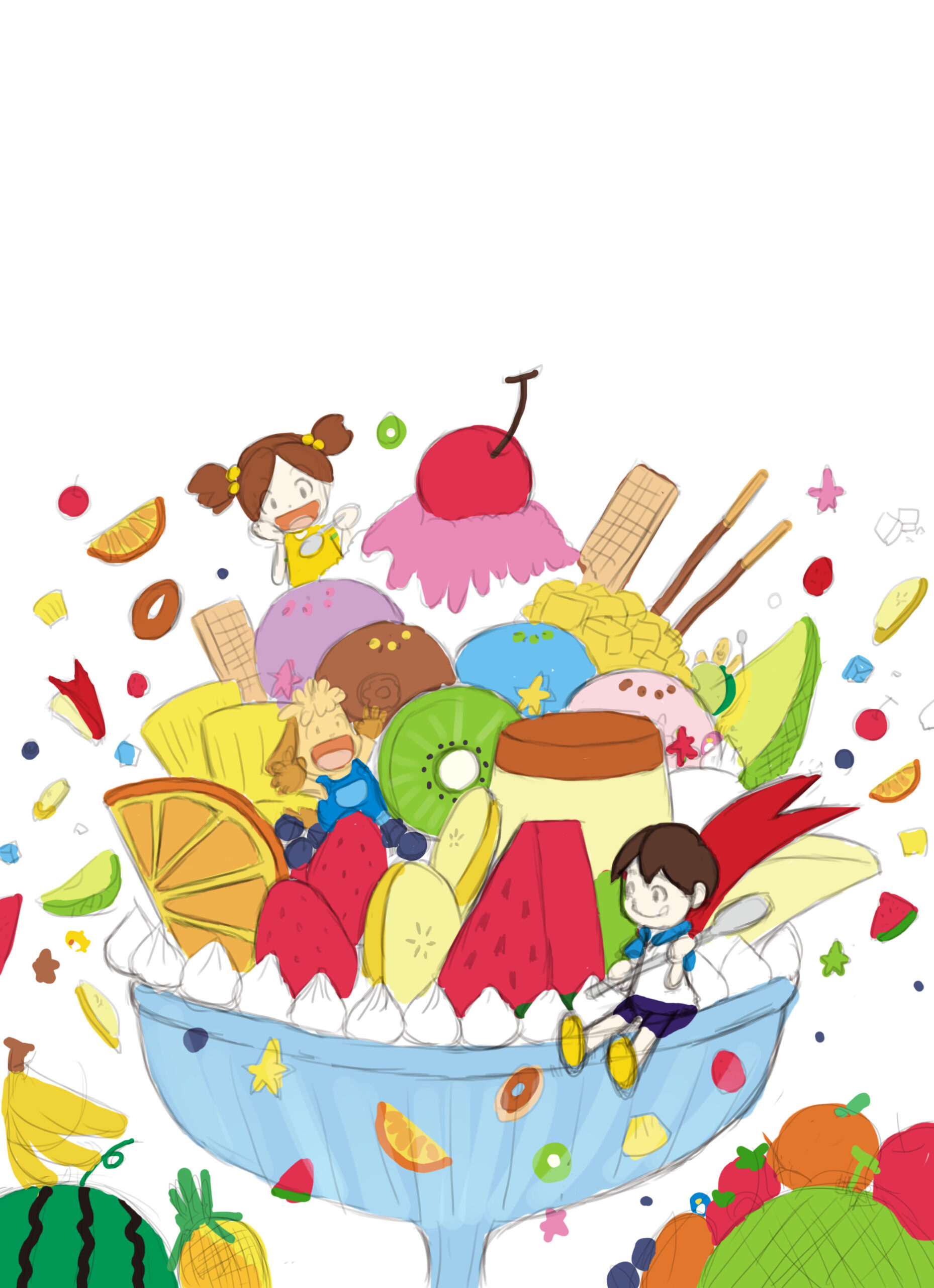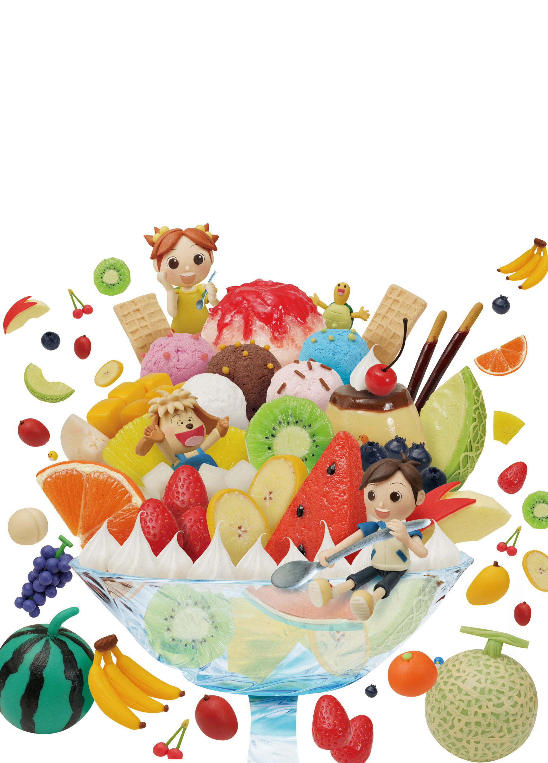 テーマは「夏休みのごほうび」。樹脂粘土で造形されたフルーツたっぷりの巨大パフェを中心に、かき氷、アイスクリーム、プリン、ポッキー、ウエハース、スイカ、バナナ、イチゴ、キウイ、オレンジ、マンゴー、ピーチ、リンゴ、ナタデココなど、本物さながらのフェイクスイーツ&ミニチュアフルーツが並びます。キャラクターたちはパフェの周囲でスプーンを持ち、夏の陽射しのように明るく、楽しい表情で登場。誌面全体が“見るだけでおいしい”世界観で構成されています。背景には真夏のフルーツが散りばめられた鮮やかなトーンと、ひんやりとしたガラス皿の透明感が共存し、“暑いのに涼しい”という相反する質感が心地よいバランスで表現されています。