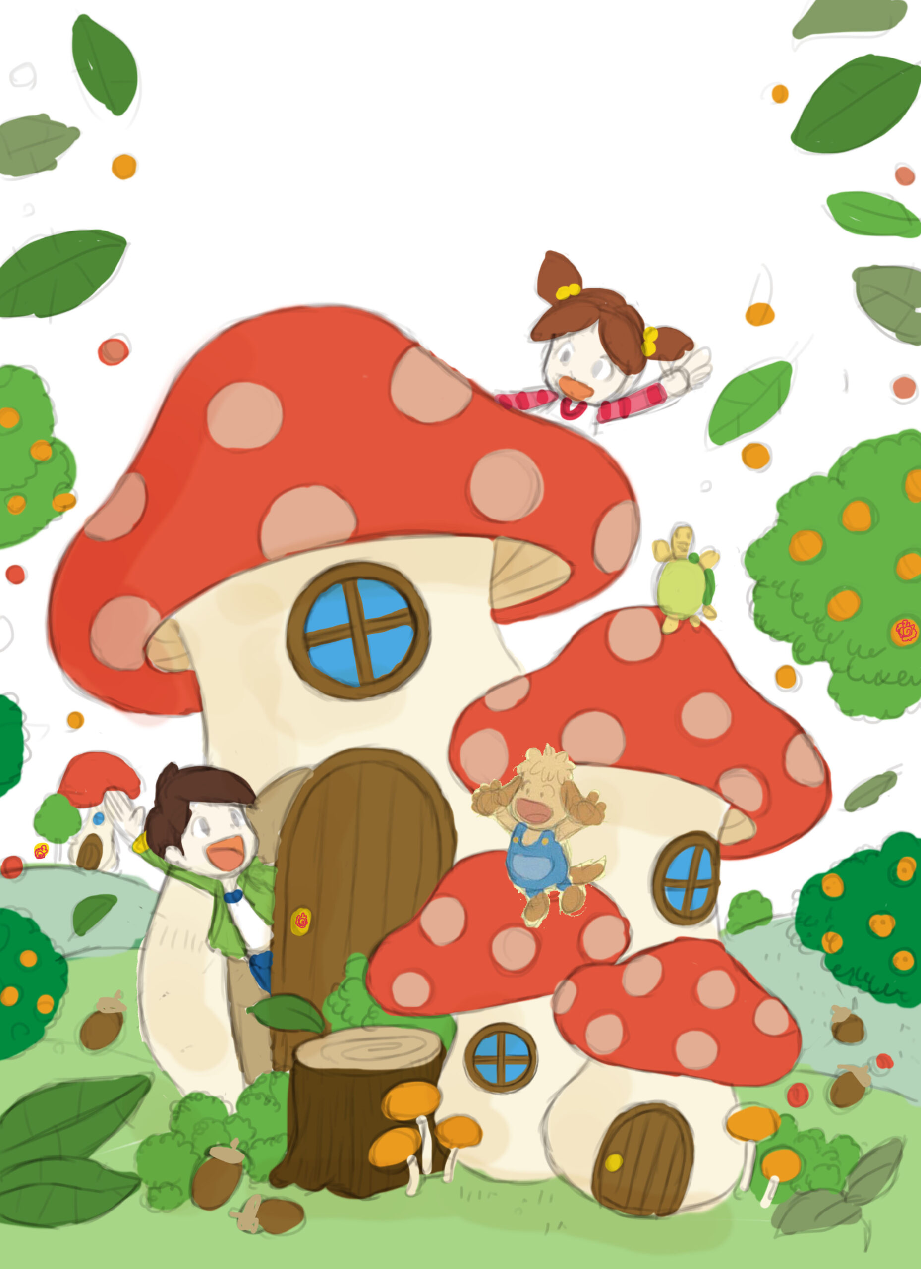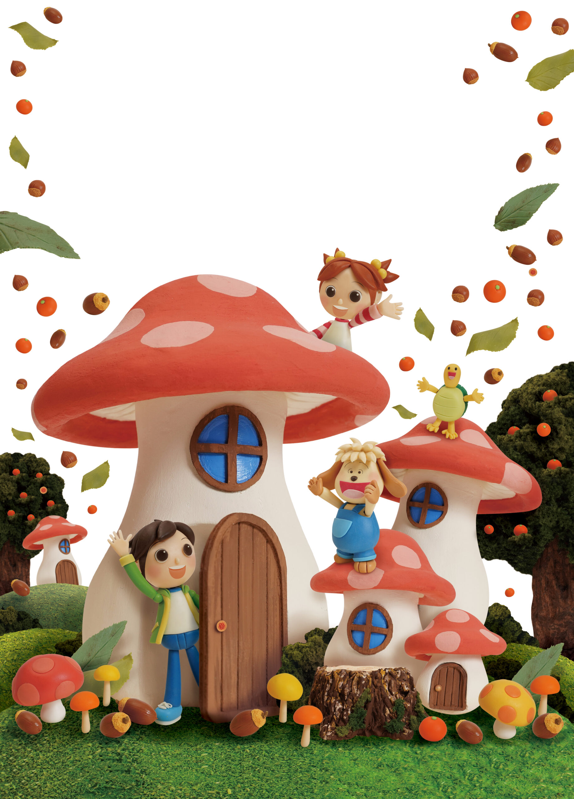 じゅん、あみ、テンテン、はるのすけたちが、カラフルなきのこの家が立ち並ぶ森を探検している様子を、リアルな造形表現と温かみのあるデザインセンスで描き出しています。ウォルナッツ・クレイワークスタジオが得意とする「リアル × ディフォルメ × ファンタジック造形」の三要素が融合した、秋らしさあふれるクレイアート作品です。