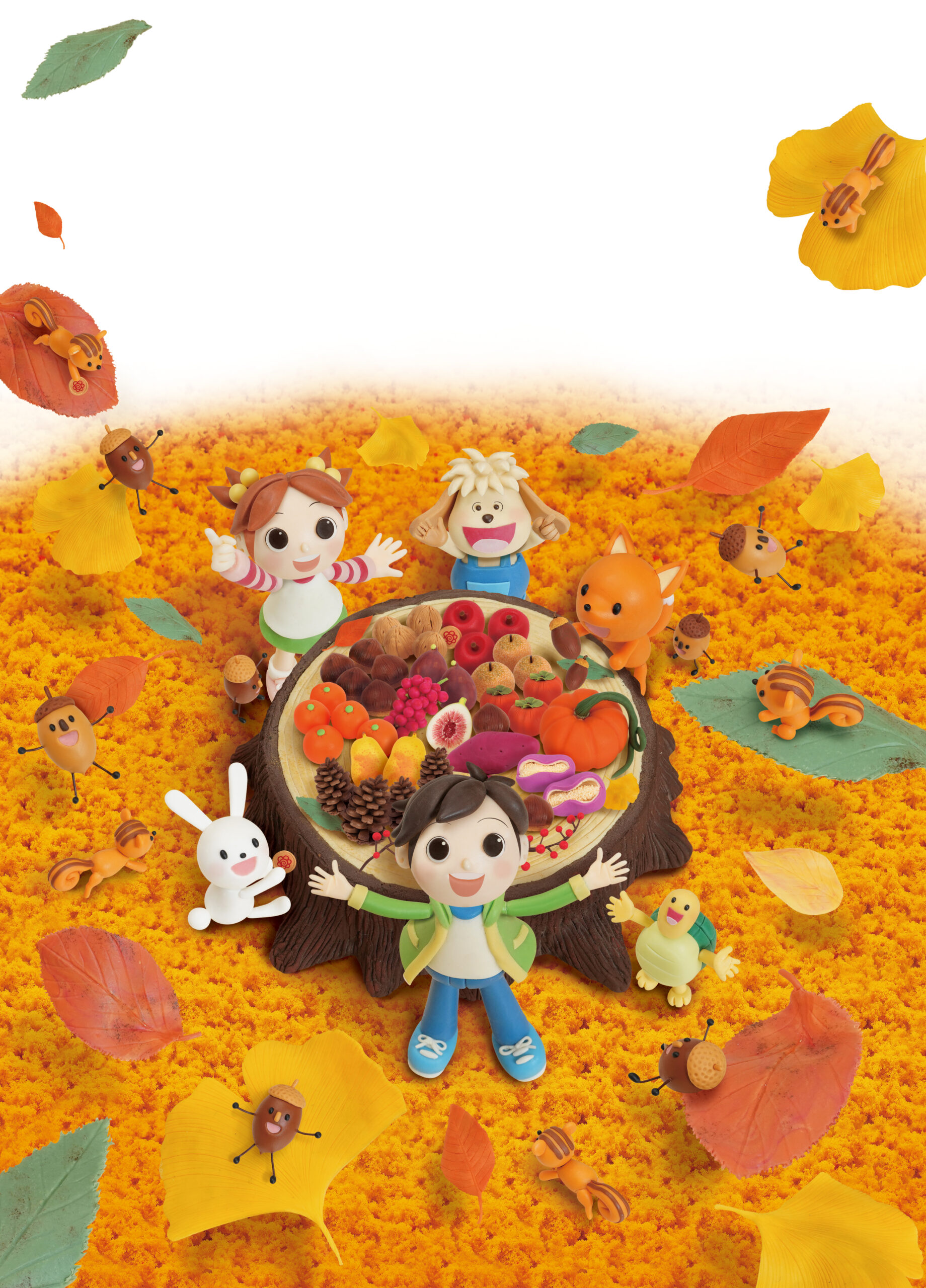 舞台は“実りの秋の森”。テーマは「紅葉の森でひろがる みんなの収穫祭」。秋色の山を背景に、中央の切り株テーブルを囲んでキャラクターたちが果物を並べる様子を描いています。誌面全体を包む紅葉は、スポンジをアクリルガッシュで染め上げた手作業のテクスチャで構成し、オレンジ・イエロー・バーガンディが織りなすグラデーションで秋の深まりを演出。切り株のテーブルは樹脂粘土と軽量粘土を組み合わせ、年輪や樹皮のシワ、木のみきの立体感を粘土カッターや棒で一本一本刻み込むように再現しました。