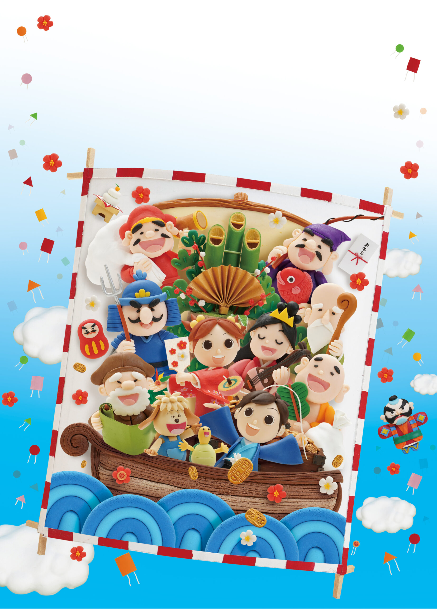 テーマは「おめでたい新春と空を舞う縁起物」。凧の中央には七福神たちが乗った宝船を配置し、そのまわりを鏡餅、ダルマ、門松、お年玉など正月を象徴するモチーフで構成。凧のベースは実際の凧と同じく竹細工と紙を用い、軽やかに空に浮かぶ質感を再現しました。七福神たちは樹脂粘土で半立体的に造形し、絵画のような平面性と粘土の立体感が融合した“浮き出す粘土絵”としてデザイン。明るい笑顔と色彩で、新年にふさわしい華やかさを演出しています。
