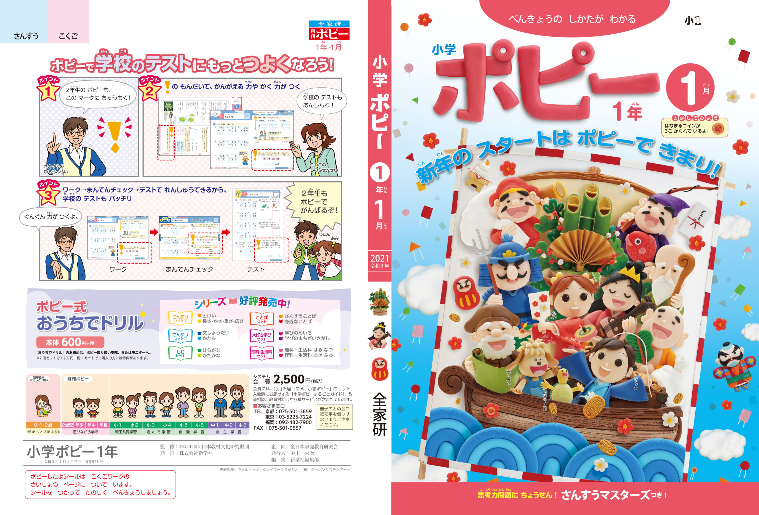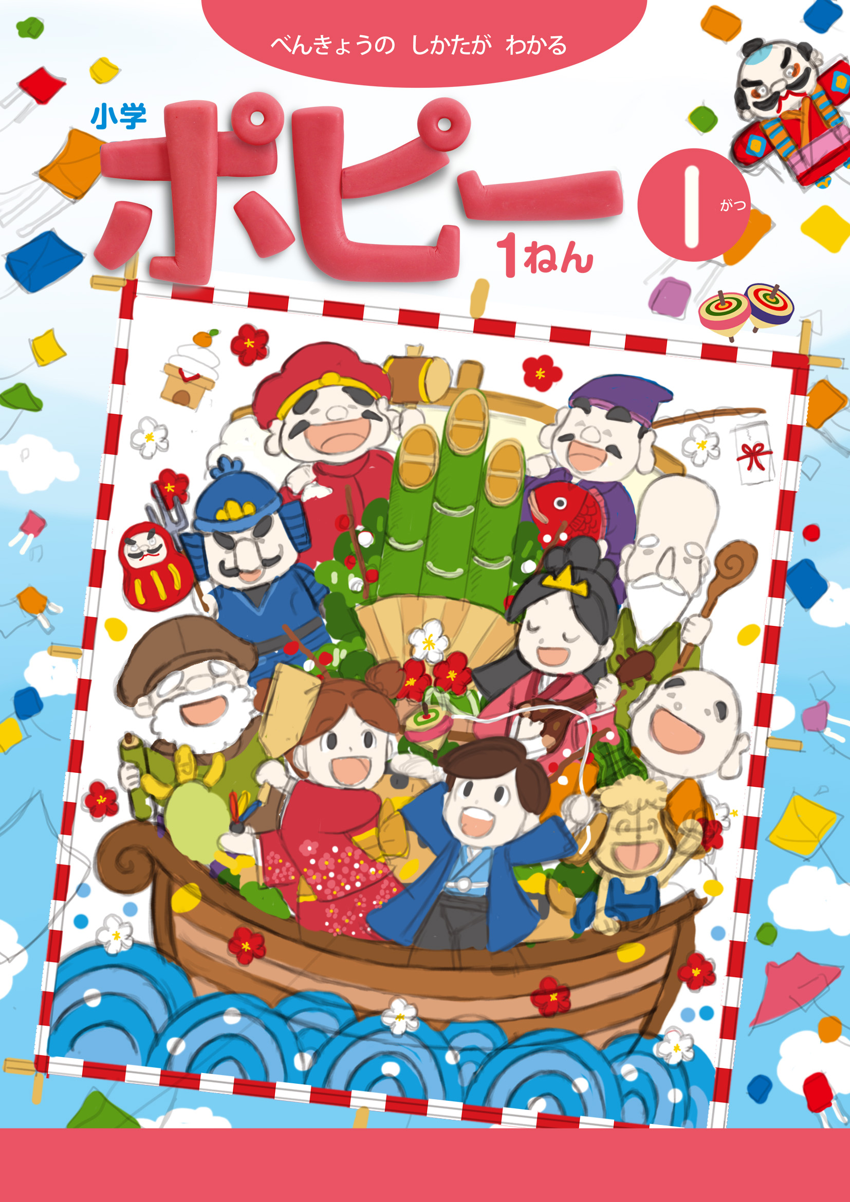 『小学ポピー「1・2年生」2021年1月号』の表紙は、キャッチコピー“新年の スタートは ポピーで 決まり!”をテーマにした、晴れやかなお正月ビジュアル。冬空に舞い上がる大凧の中に、七福神の宝船やダルマ、鏡餅、門松などおめでたい縁起物が勢ぞろいし、新年の希望と楽しさを立体的に描いたクレイアート作品です。じゅんとあみたちキャラクターは華やかな着物姿で登場し、凧を見上げながら新しい年のはじまりを祝福しています。誌面全体に福と笑顔があふれる、にぎやかで縁起の良い構成です。