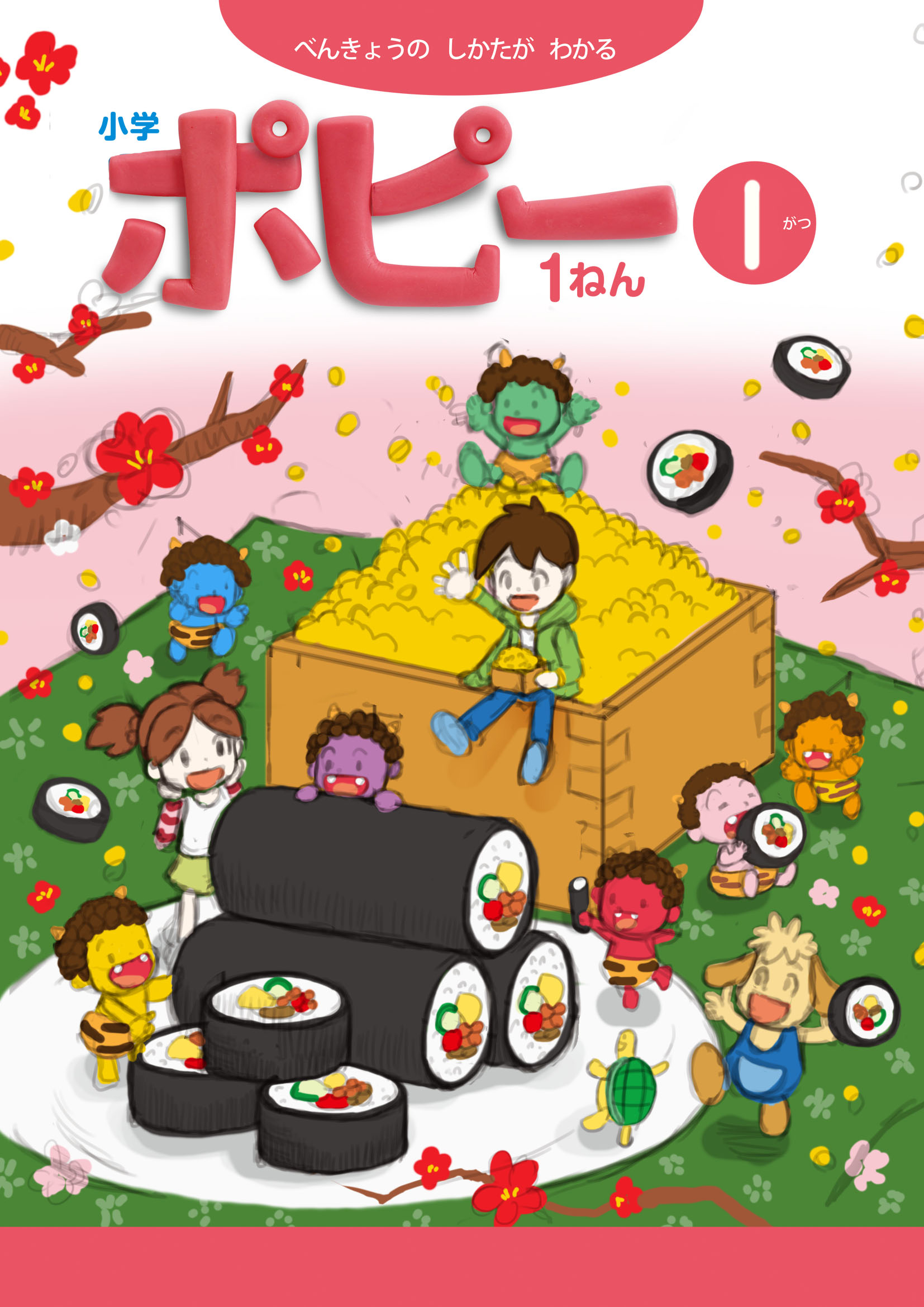 『小学ポピー「1・2年生」2021年2月号』の表紙は、“節分”をテーマにしたにぎやかで楽しいクレイアート作品。カラフルな鬼の子どもたちと一緒に、じゅん・あみ・テンテン・はるのすけたちが豆まきを楽しむ様子が描かれています。風呂敷の上には節分の豆や恵方巻きが並び、空には梅の花と豆、そして恵方巻きが舞うように広がる、華やかでユーモアたっぷりの2月号ビジュアルです。