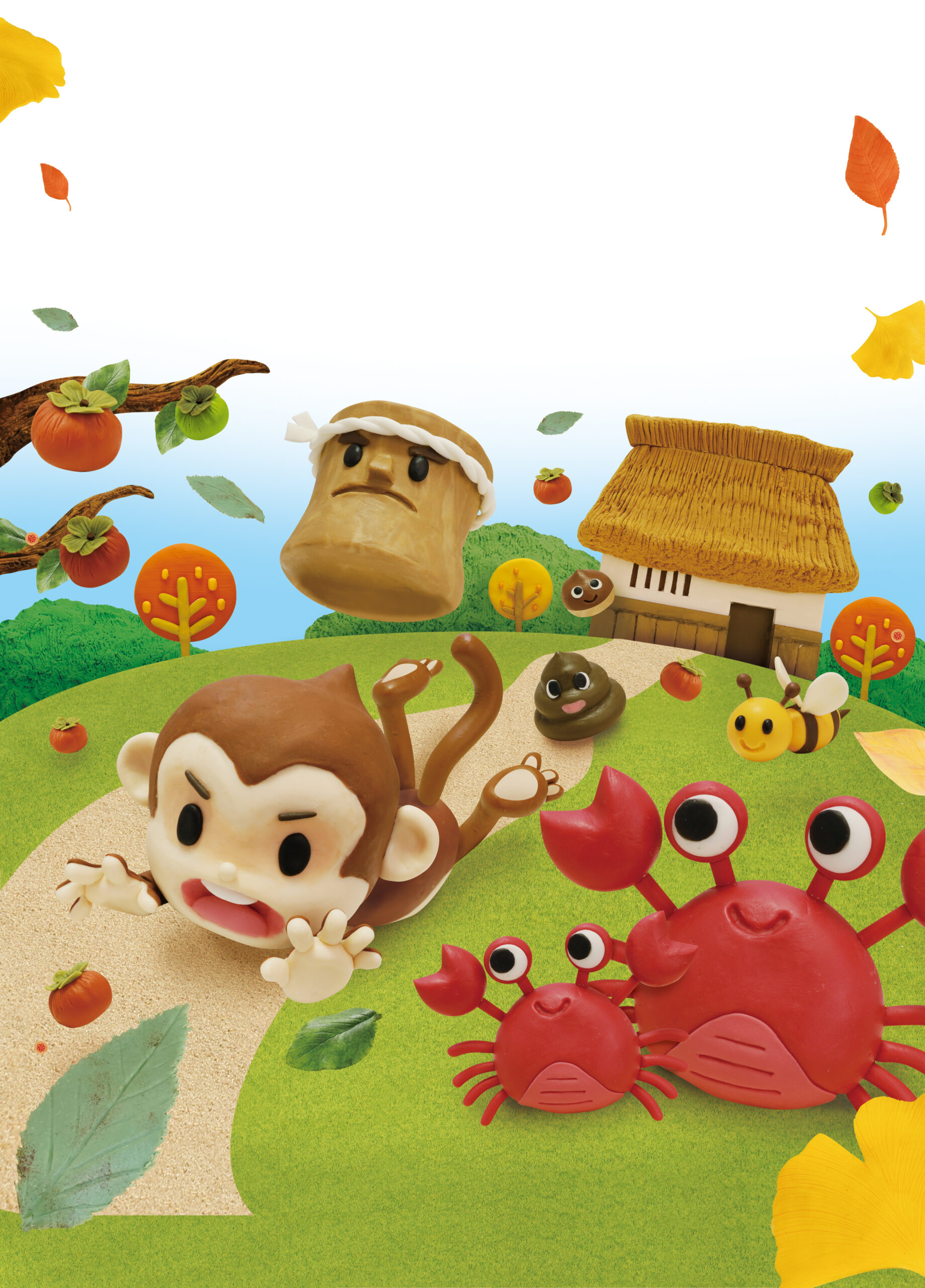 キャラクターはすべて樹脂粘土によるフルハンドメイド造形。カニの親子は丸みを帯びたフォルムで愛らしく、ハサミの動きや表情の違いで親子の個性を表現。思わず転ぶ猿は表情にユーモアを持たせ、“ドタバタ劇”として楽しめるデザインに仕上げました。うす、牛のくそ、くり、ハチといった仲間たちも、それぞれの特徴を生かしたコミカルな造形で構成。空中に飛ぶうすやハチは吊り撮影を用い、動きと躍動感を感じられる演出にしています。背景の山々は軽量粘土をベースに歯ブラシで凹凸をつけ、自然な土肌を再現。茅葺き屋根の猿の家はスチロールボードで骨格を組み、屋根部分を軽量粘土で制作。1本ずつ粘土カッターで後付けした茅の束を、爪楊枝でかき出すように加工してリアルな繊維感を表現しています。地面は芝パウダーと土パウダーを併用し、猿が逃げ出していく道の質感を立体的に再現。柿の木は木製粘土を使用し、幹や枝の質感に秋の深まりを感じる色調を採用。実った柿は樹脂粘土によるミニチュアフルーツで、熟した柿と青い柿の2種を制作。ヘタや色味の違いまで丁寧に作り分けることで、自然のリアリティを表現しています。